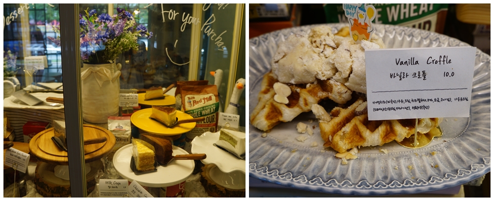 다양한 케이크와 크로플이 몇 종류.