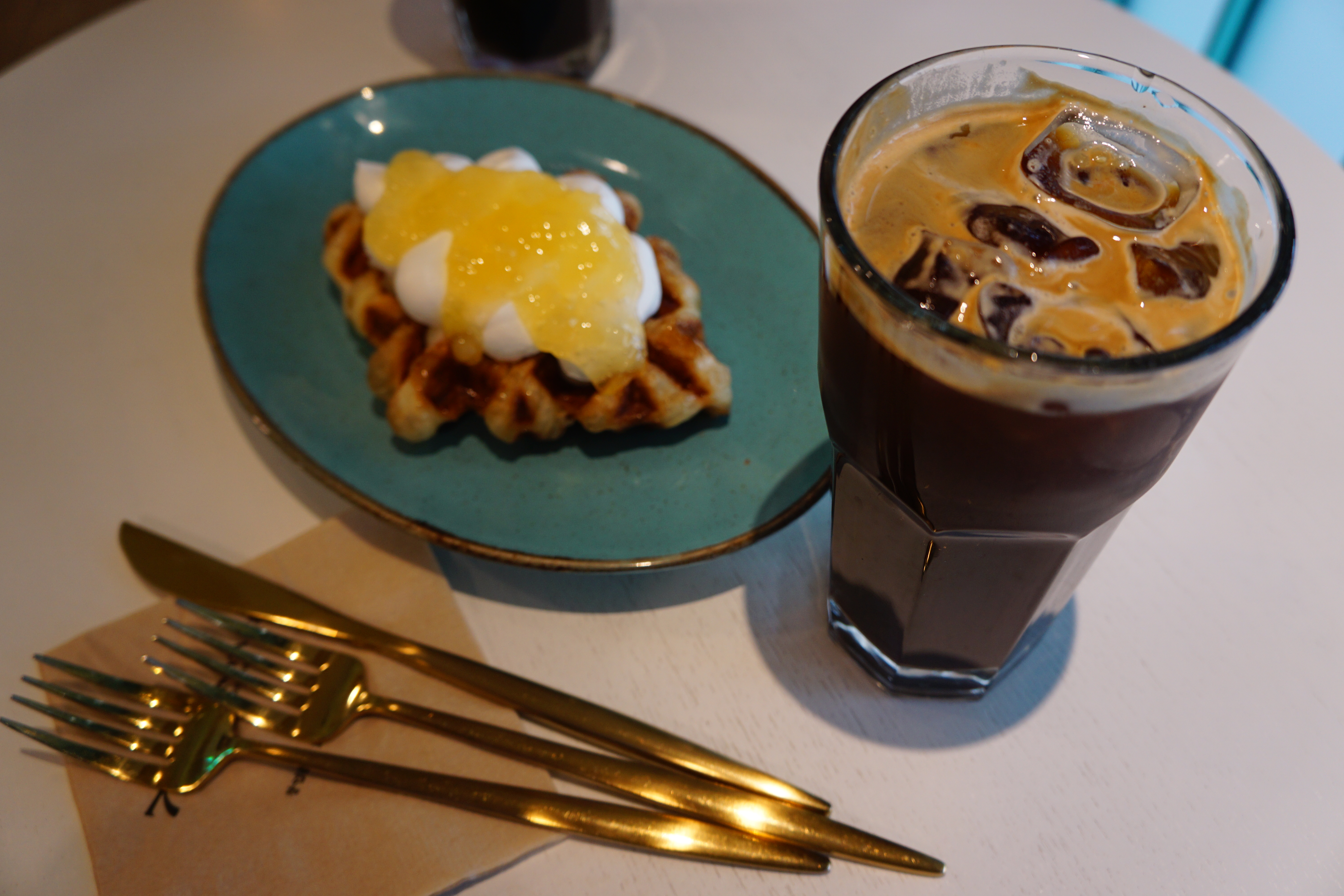 허니애플크로플과 아이스디카페인커피.