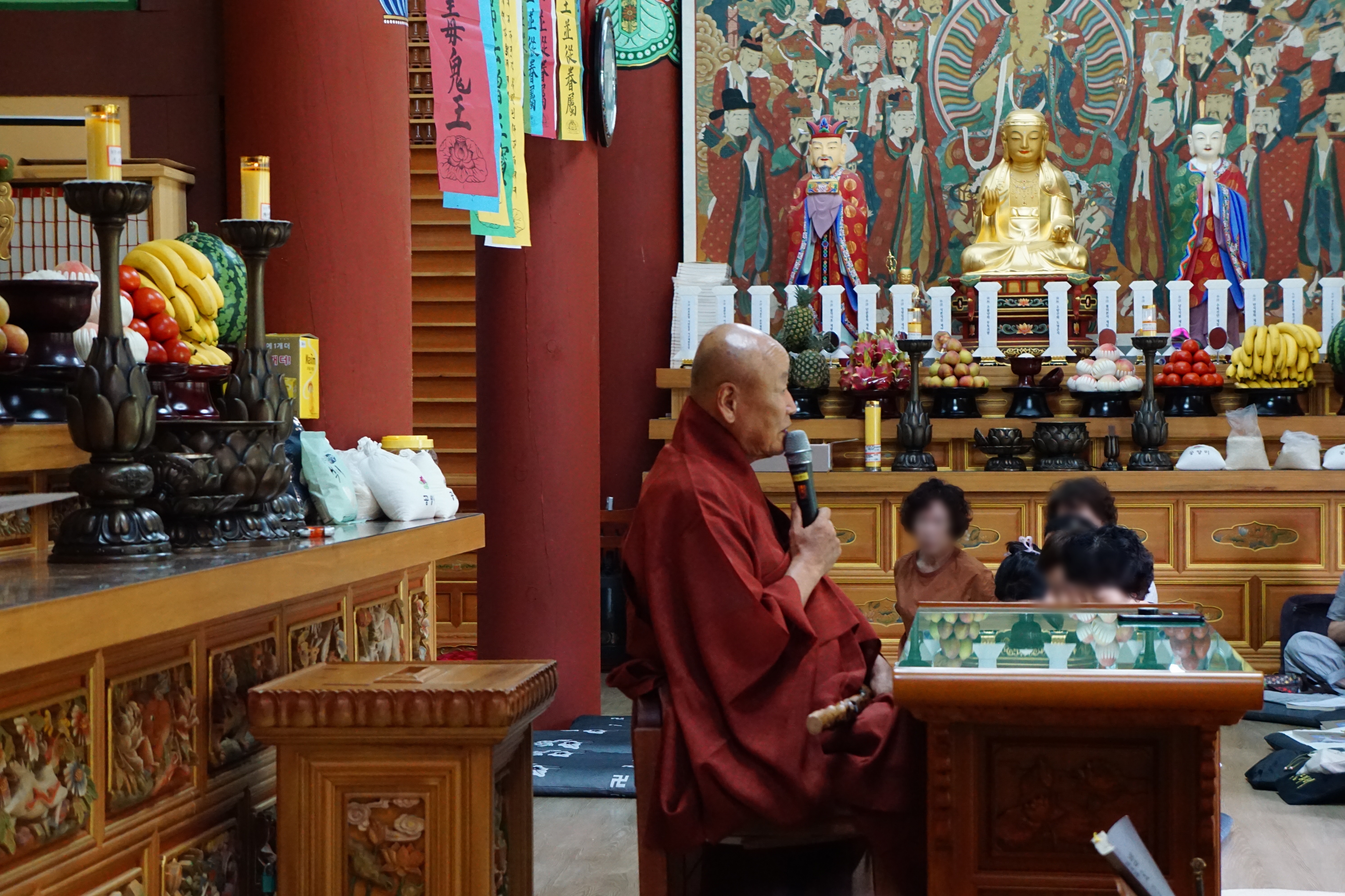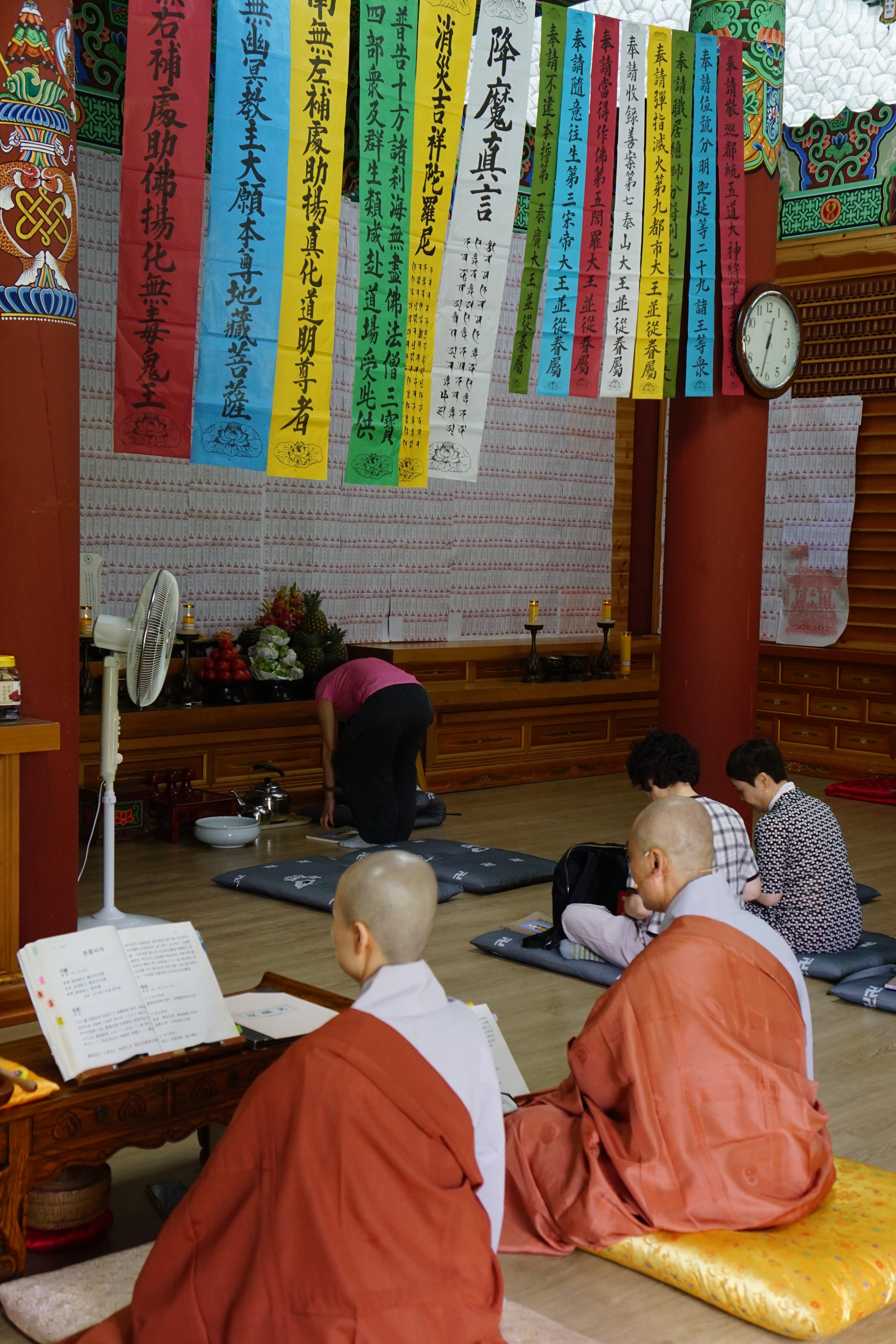지장보살님 앞에 십대왕님을 모셨는데, 주지스님한테 큰스님께서 '6재까지는 조금 쉽게 도청해도 된다. 그 어른들 청해서 공양 대접하면 된다' 해서 한 번에 3청하면 되는데, 기어이 각청을 해서 시왕님 열 분에 사자 여섯 청 해서 청만 전부 십육 청을 세번씩 해서 48청에 상단 3청,지장 3청,전부 54청을 하시는 주지스님.(각청을 하시는데 거의 한시간 이상 걸렸다.)