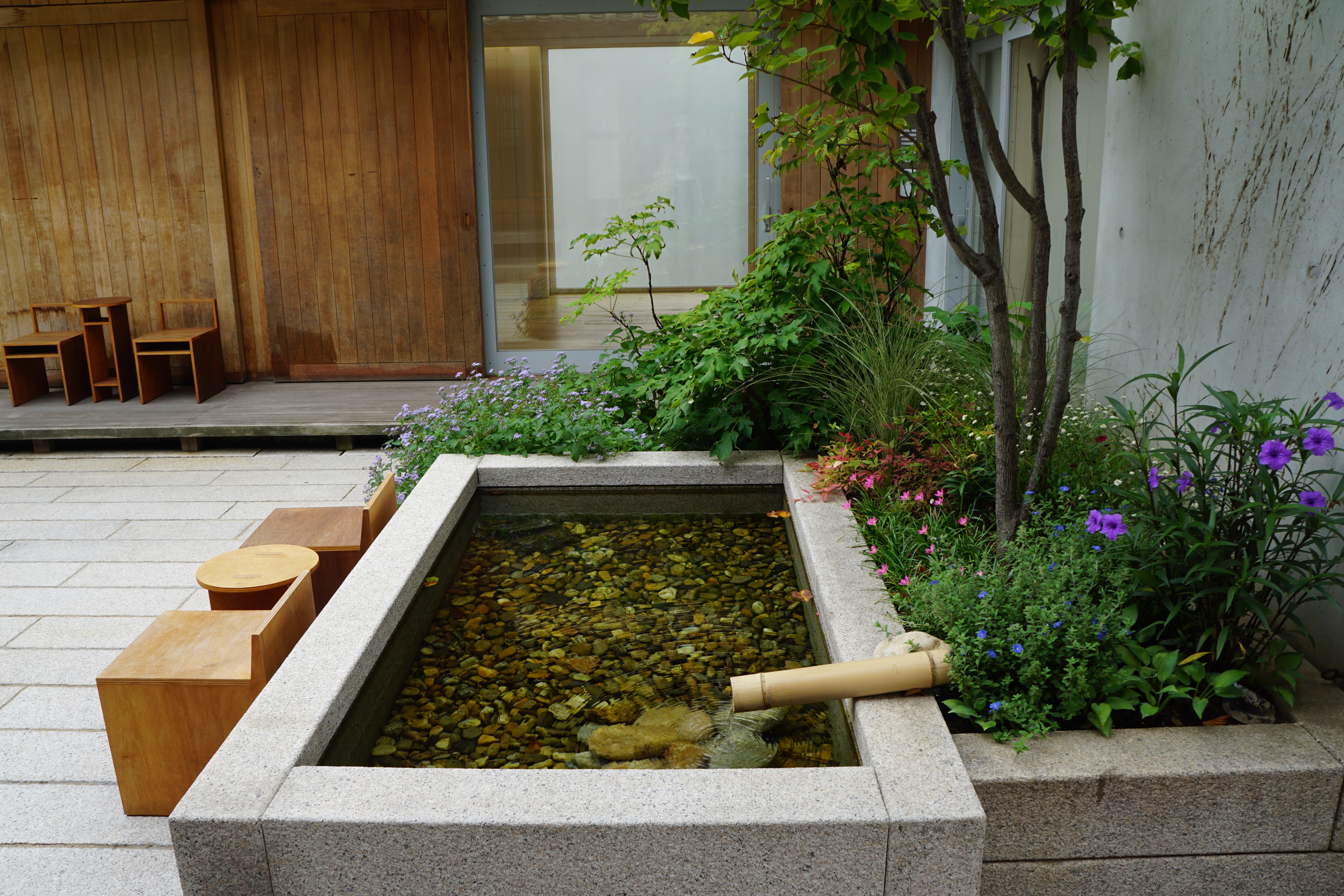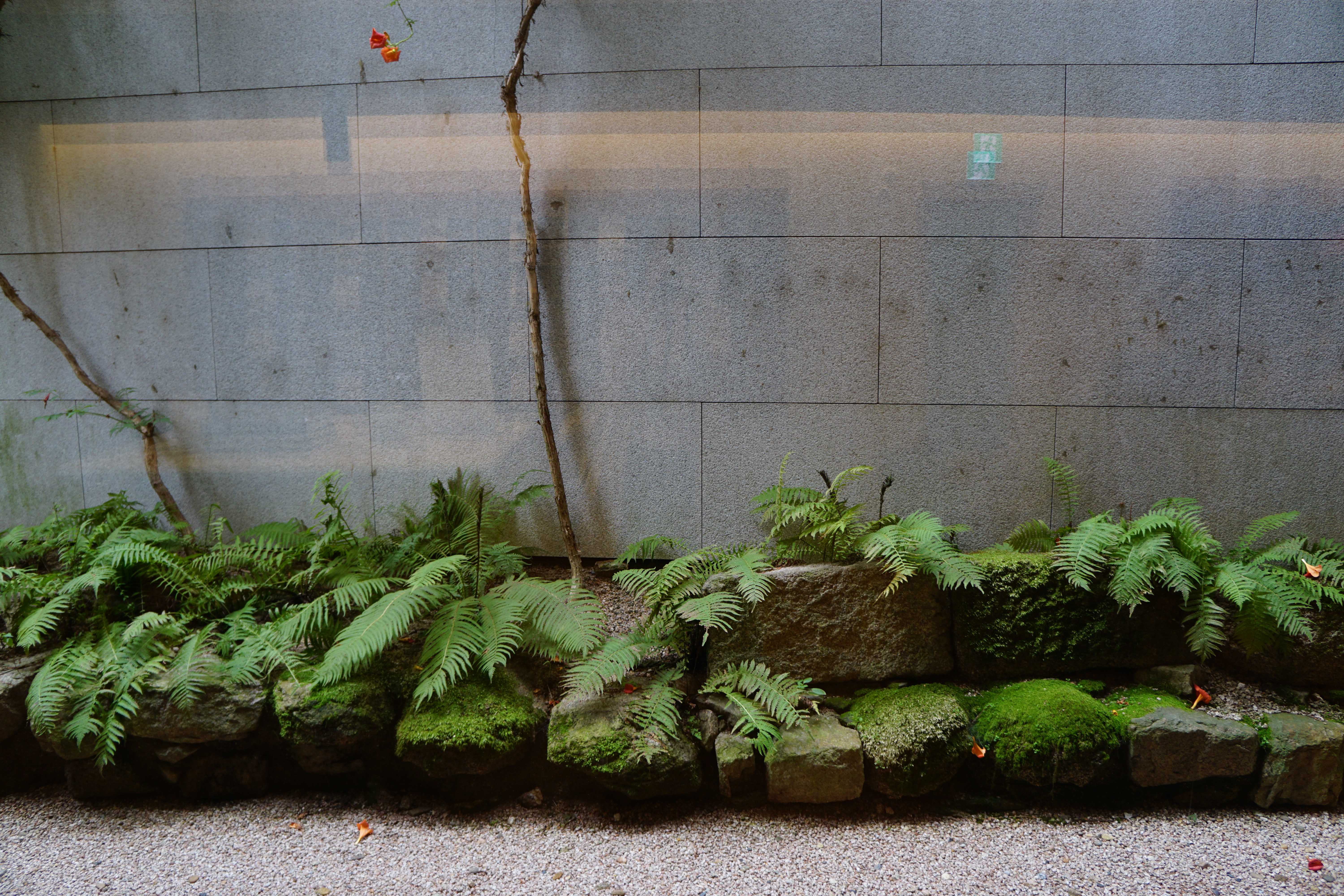 건물과 담 사이에 양치식물과 능소화가 어우러진 좁은 정원이 있다. 예쁘다...