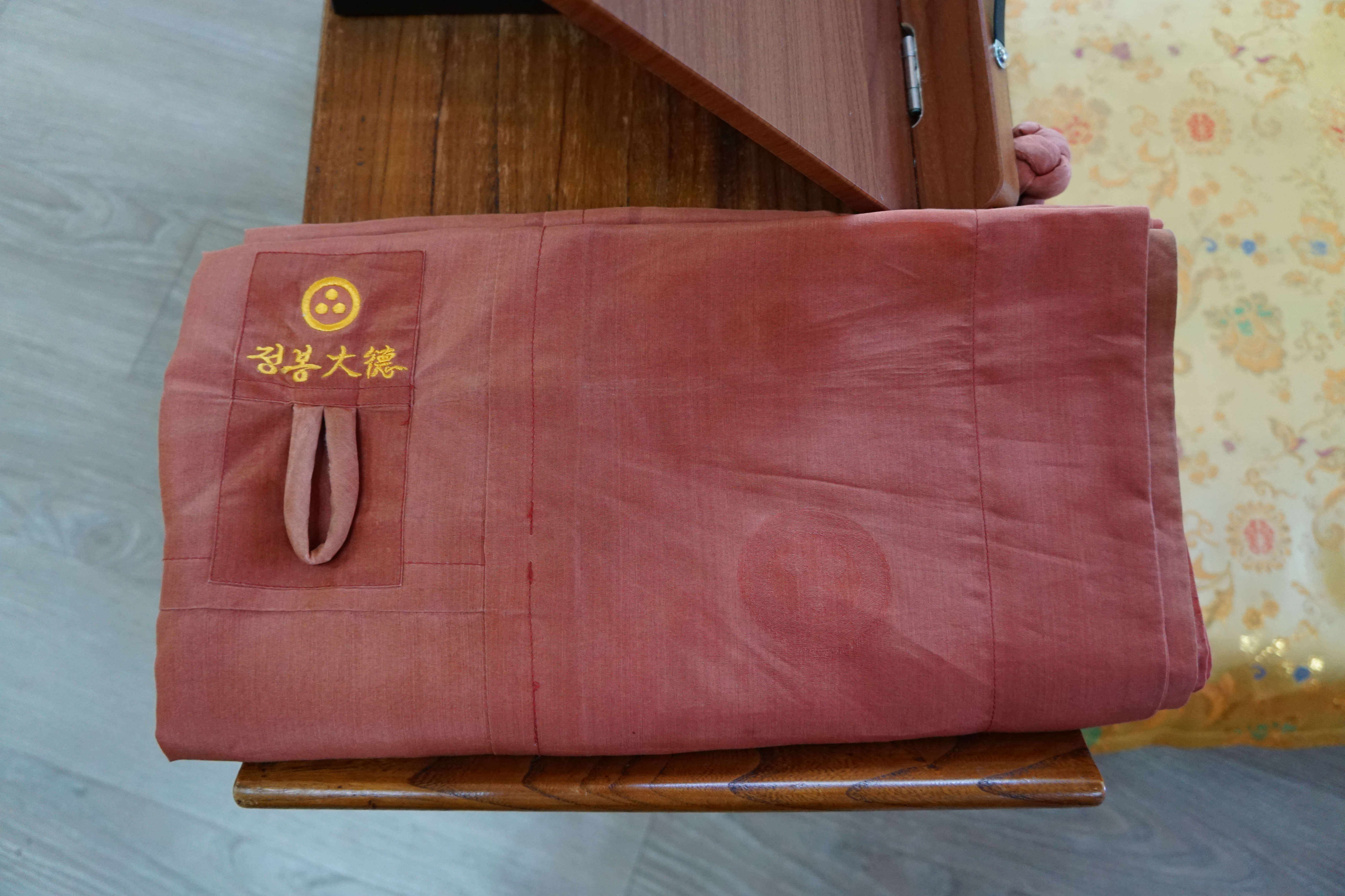 가사가 흘러내리지 않게 안쪽에 손잡이까지 있고, 가사 보시를 한 사람의 이름과 '梵魚寺'라 새긴 글씨가 보인다._()_