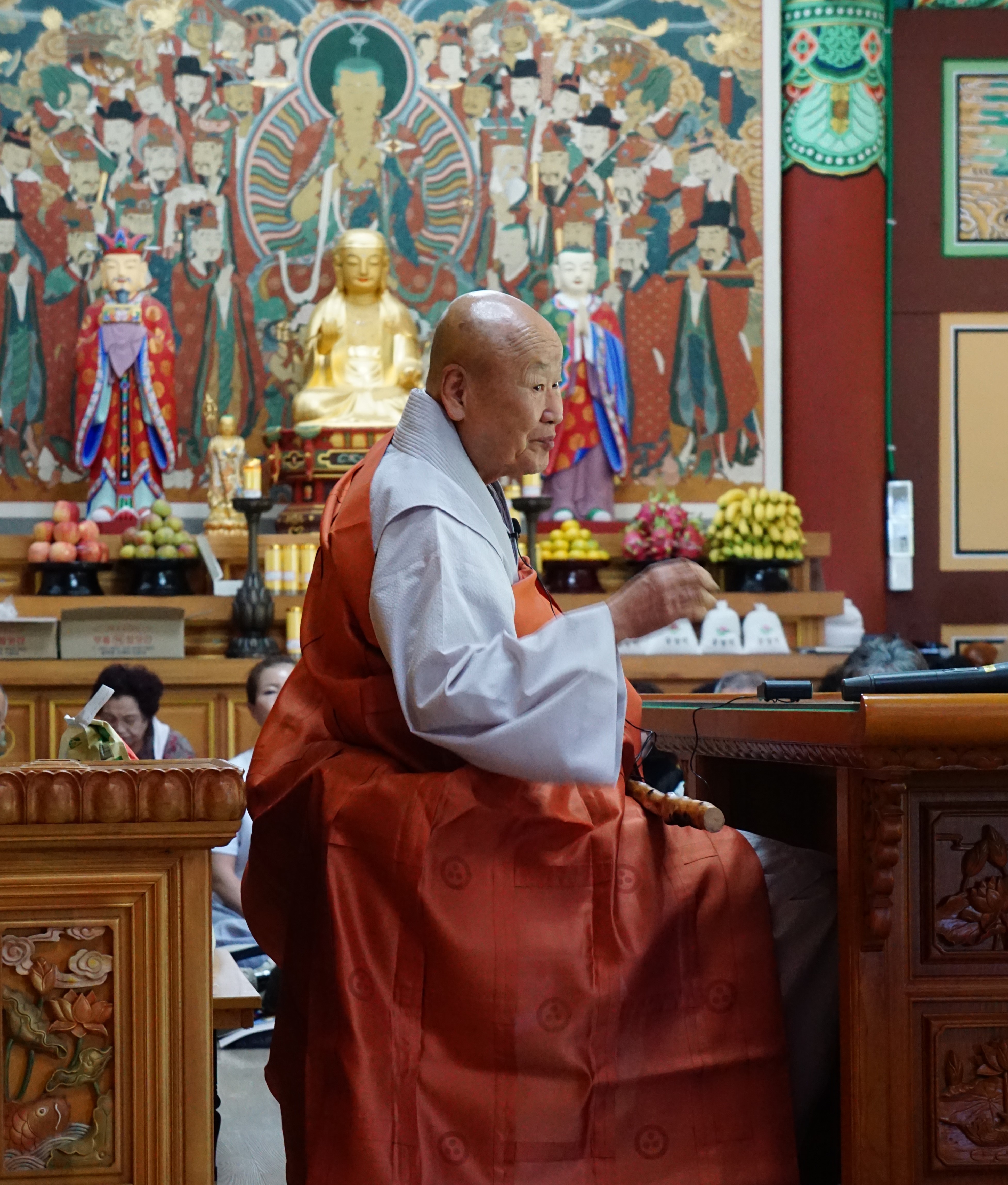 법상에 앉으신 큰스님 가사가 유난히 수려하다고 생각했더니 신심깊은 보살님이 큰스님께 가사불사의 공덕을 지었나 보다.