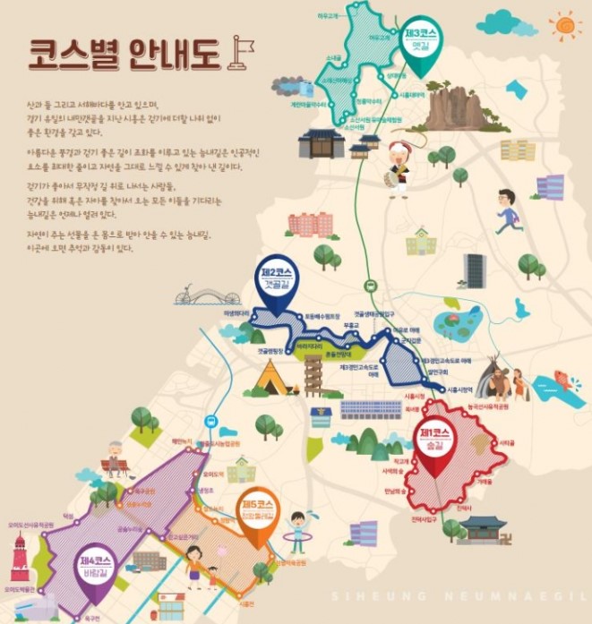 찾아 낸 길이다. 특이하게도 연결된 길이 아니라 코스 마다 시작점이 다르고 각각 원점회귀한다.(각각 13~17km)