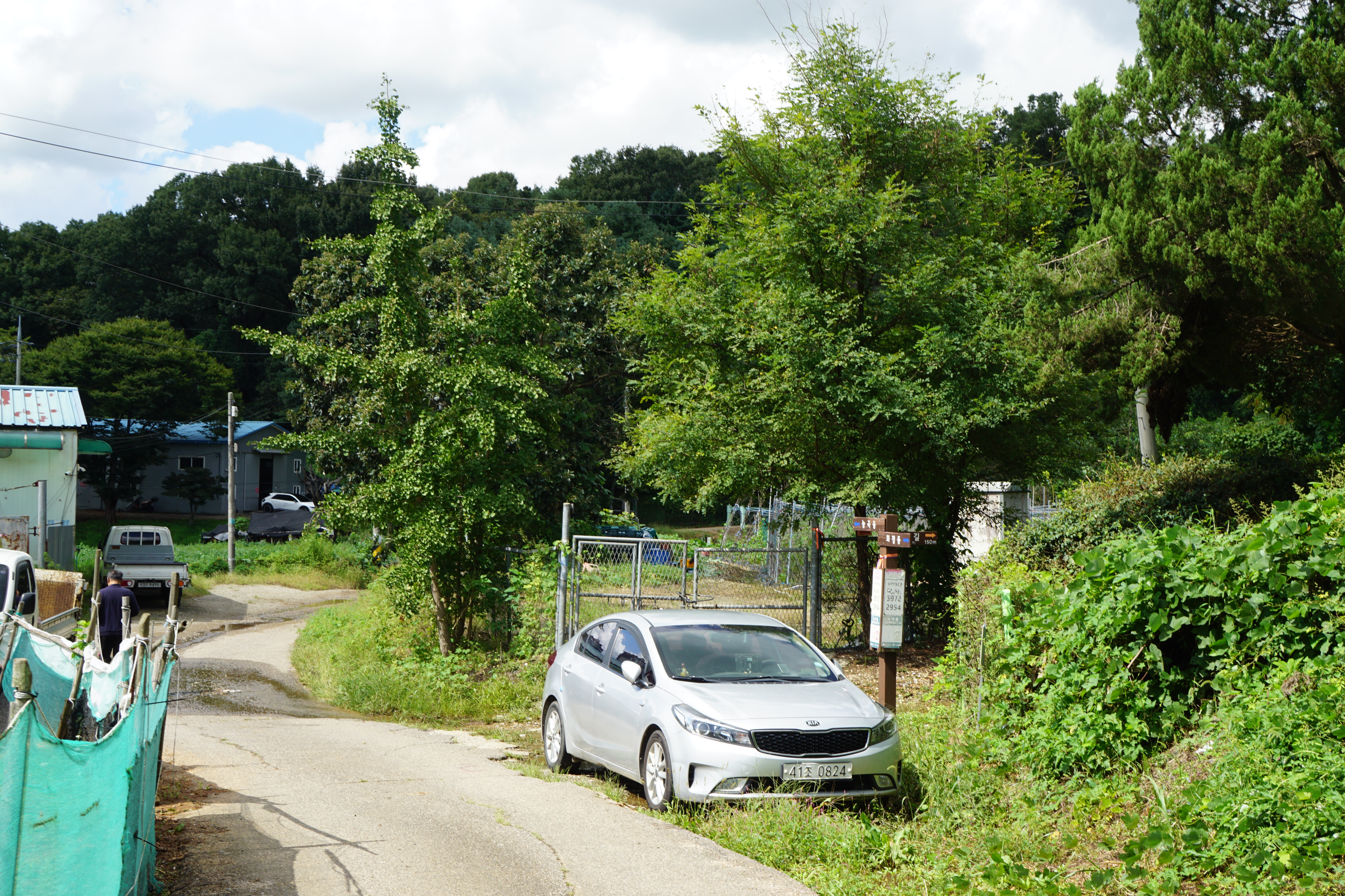 '가래울 마을'로 내려와 1km 떨어진 곳의 이정표 속 '잣나무조림지'로 가는 길의 공장지대 사잇길을 지나