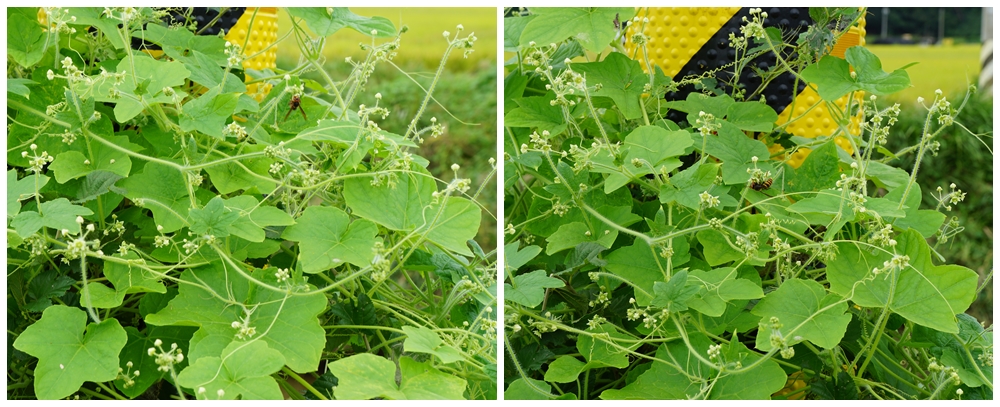 가시박 덩쿨 주변으로 말벌들이 매달려있다.