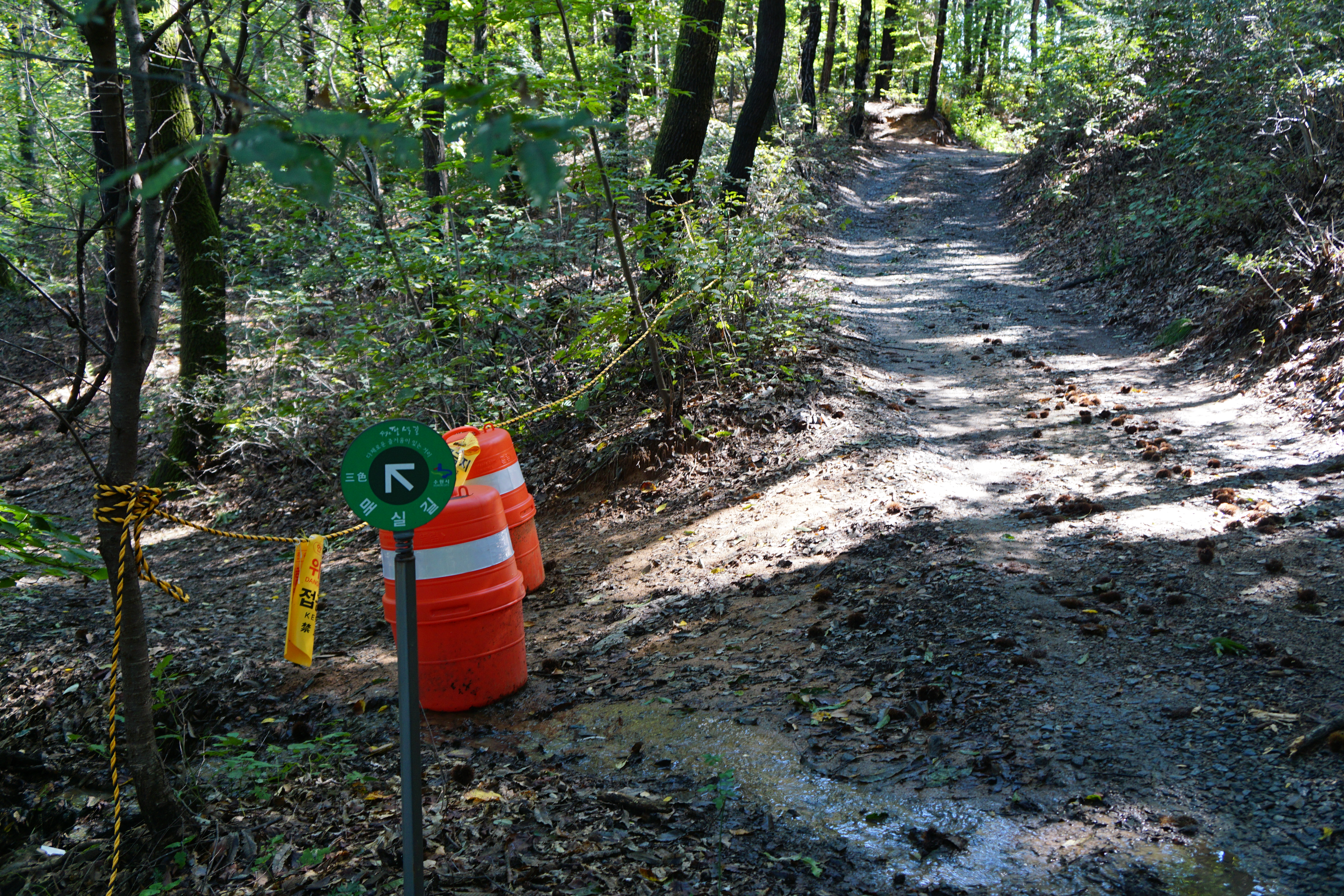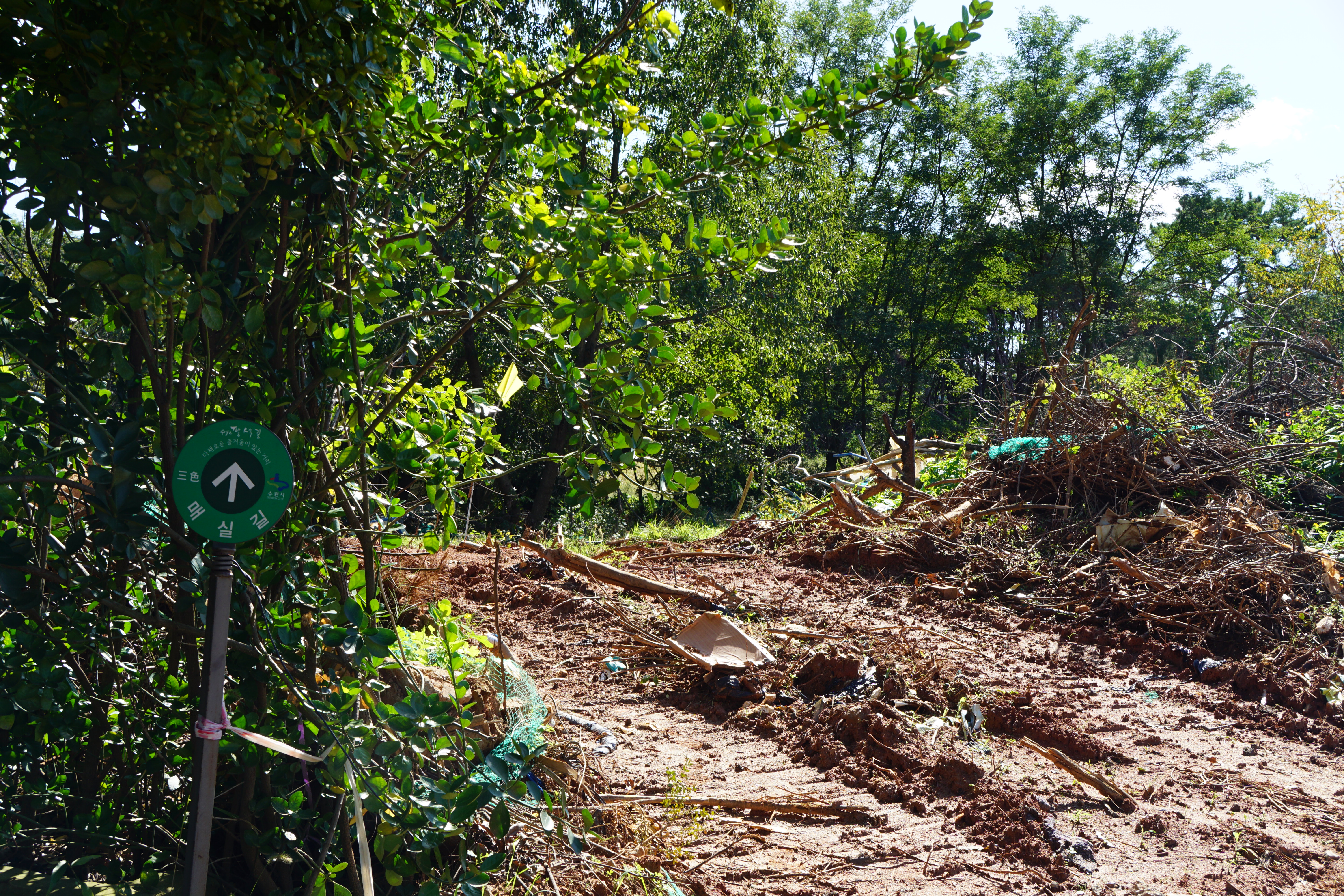 공사 중에 뽑혔던 이정표는 방향을 잃고 땅에 꽂힌 흔적이...그래서 화살표 쪽에는 길이 없다.