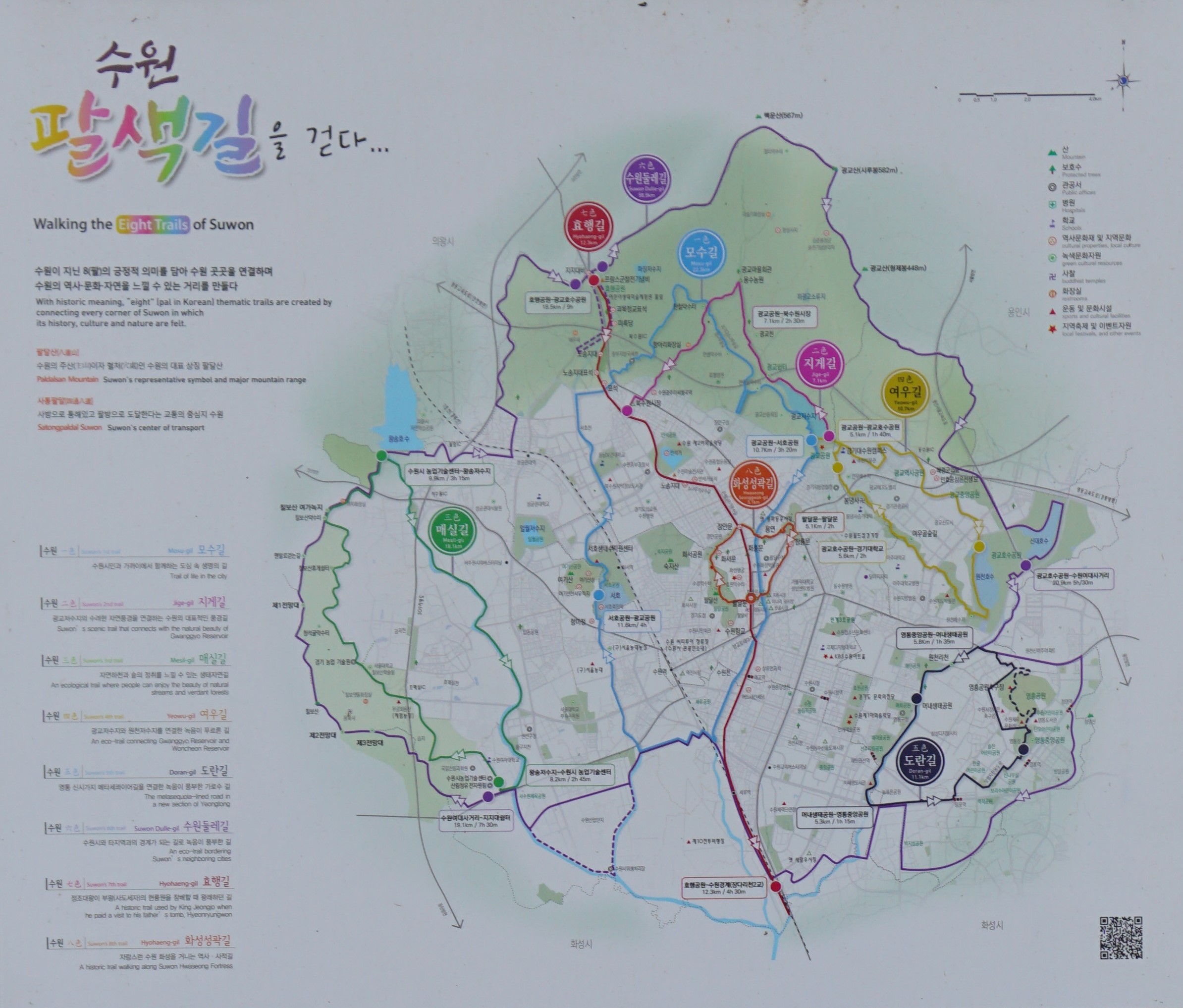 수원 팔색길은 1)모수길 2)지게길 3)매실길 4)여우길 5)도란길 6)수원둘레길 7)효행길 8)화성성곽길