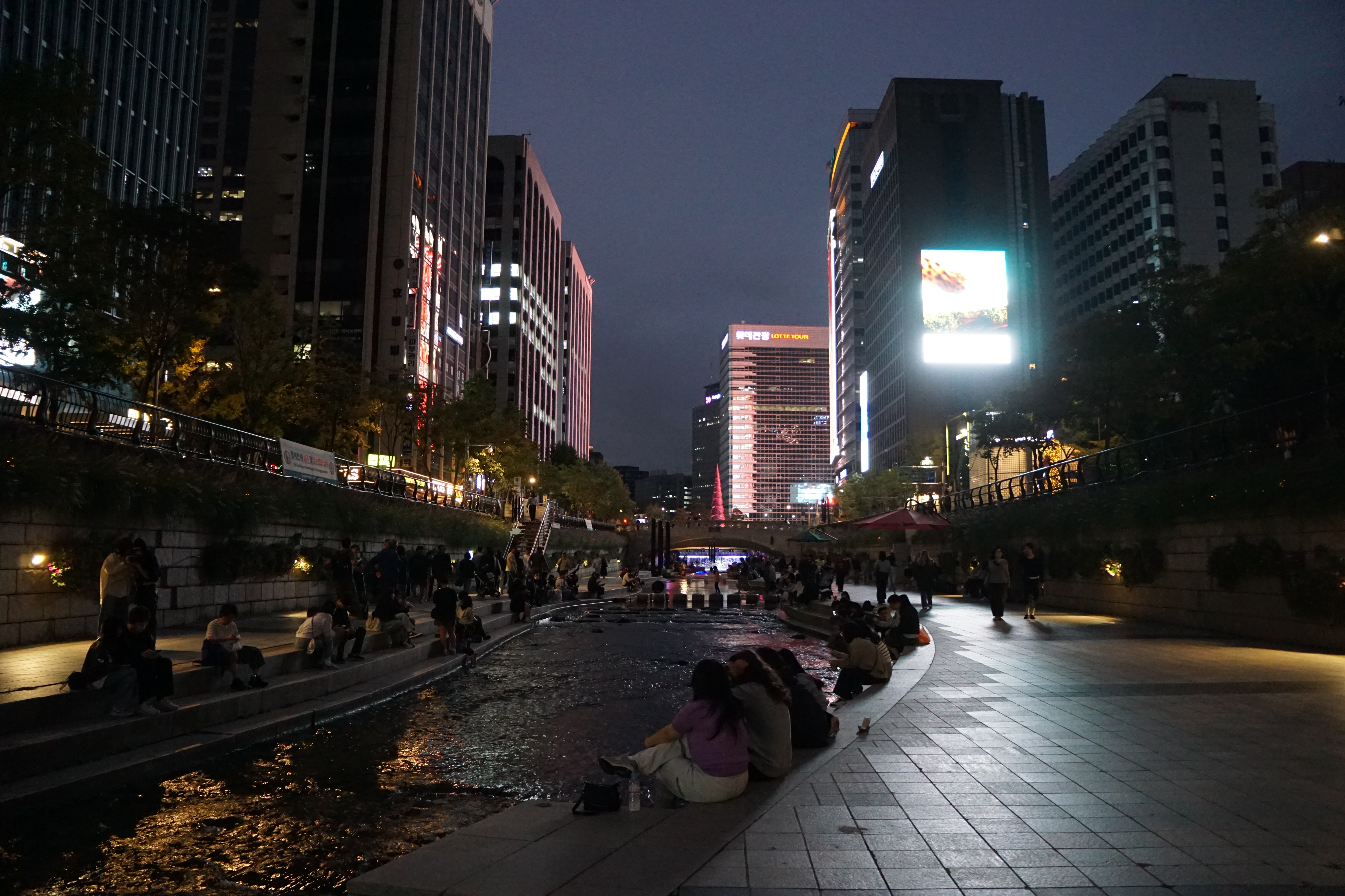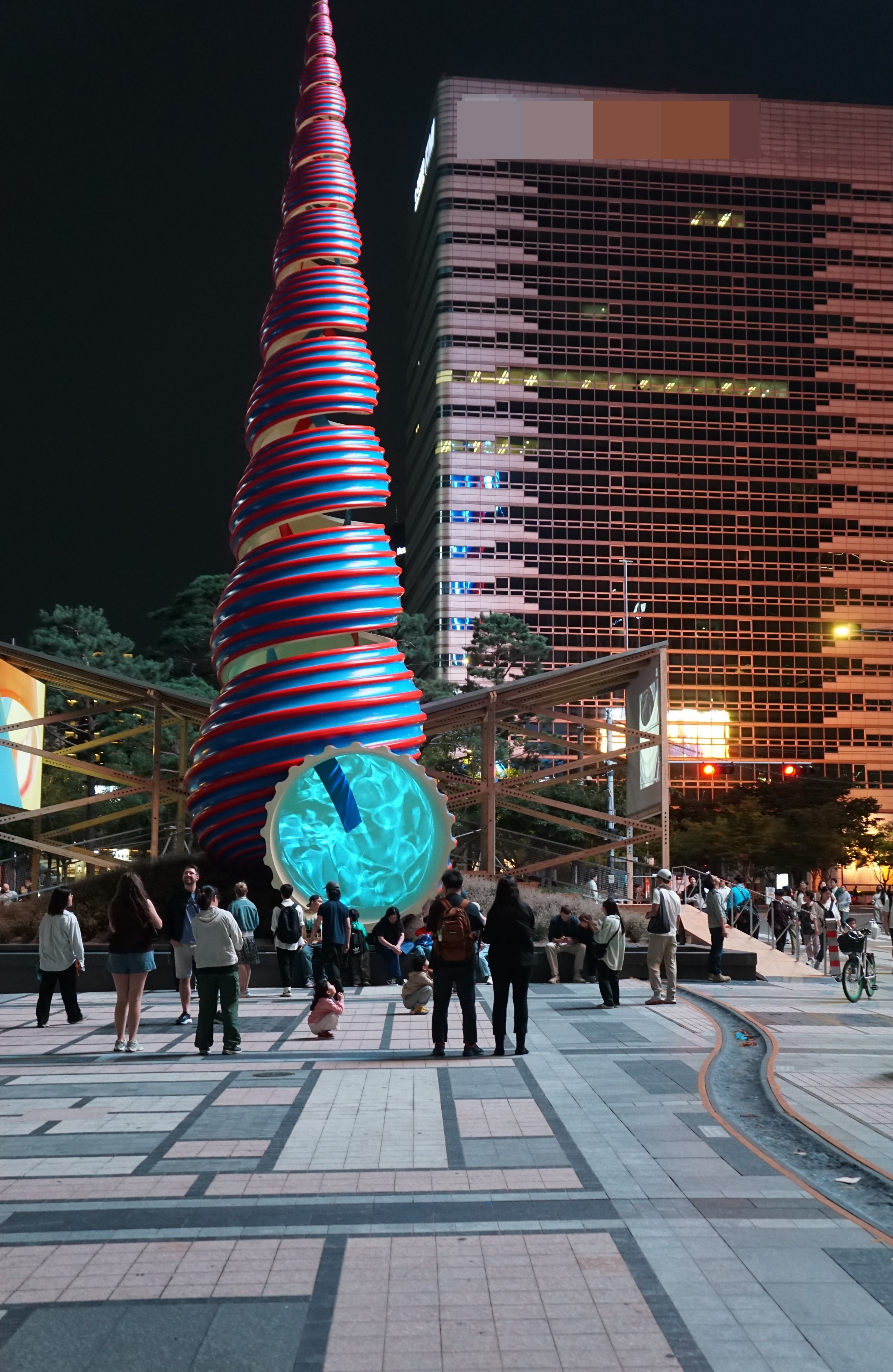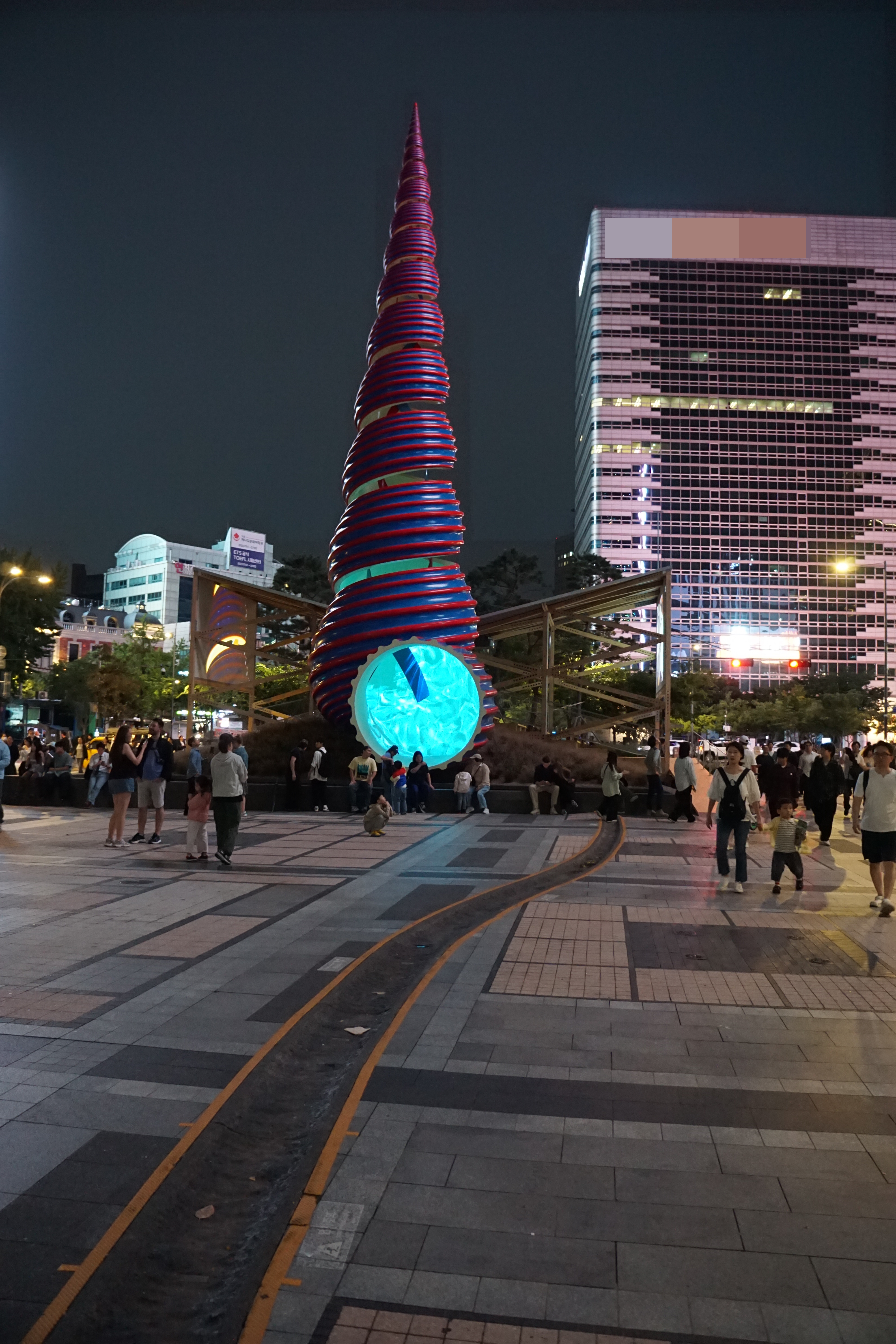 바로 뒤에는 행사 설치물이 풍경을 해치고, 대로 건너 높다란 건물 외벽의 불빛 간판은 더 거슬린다.