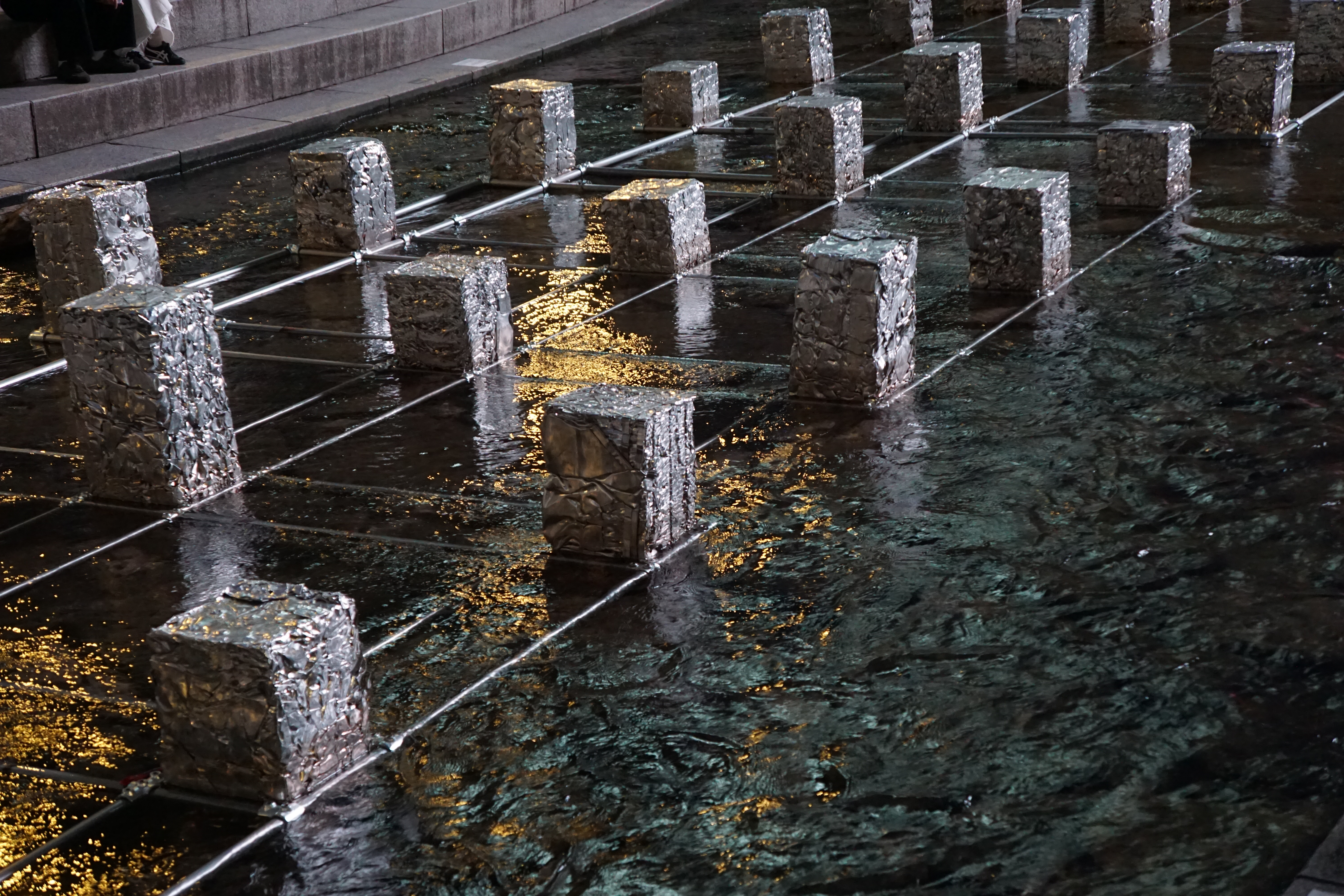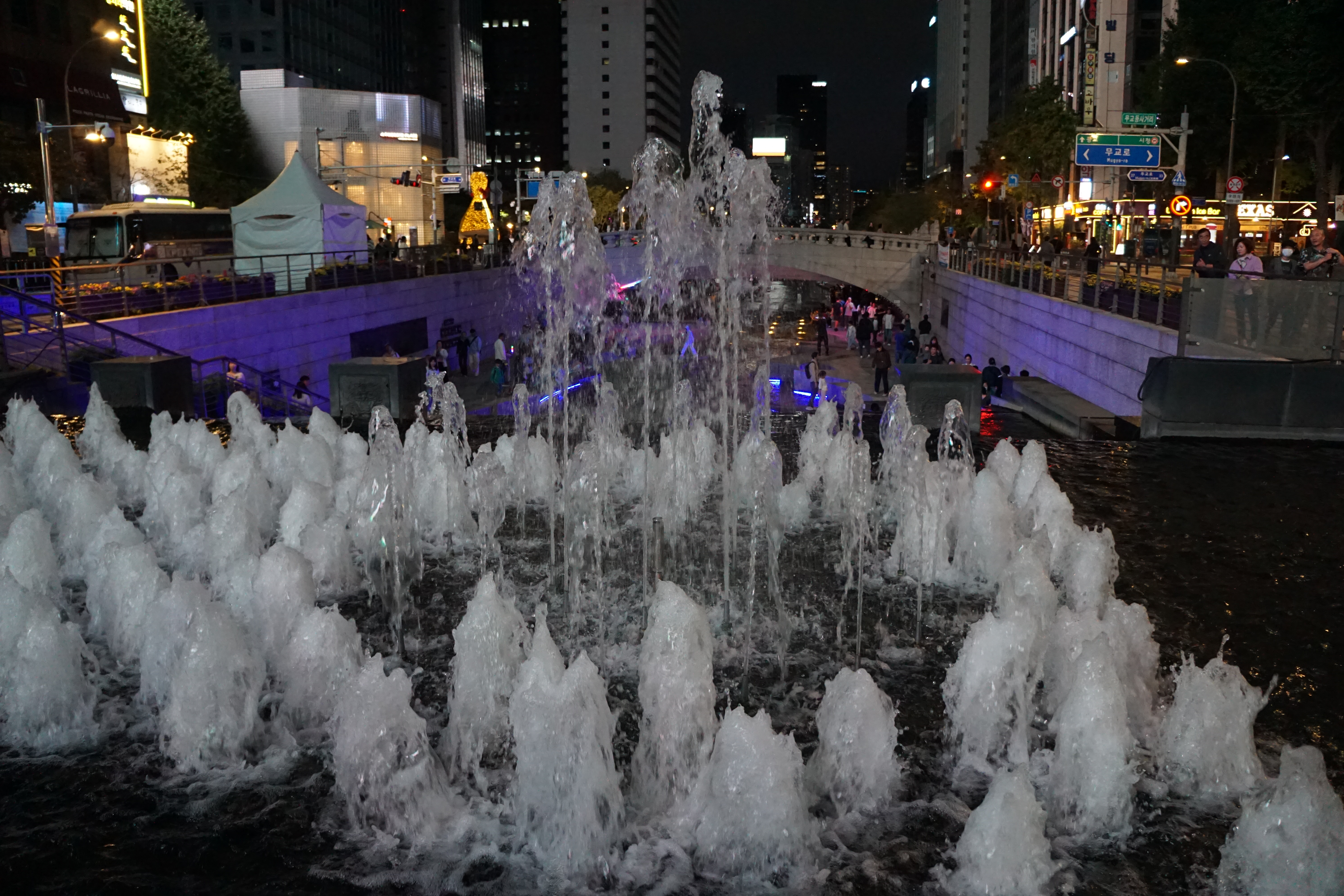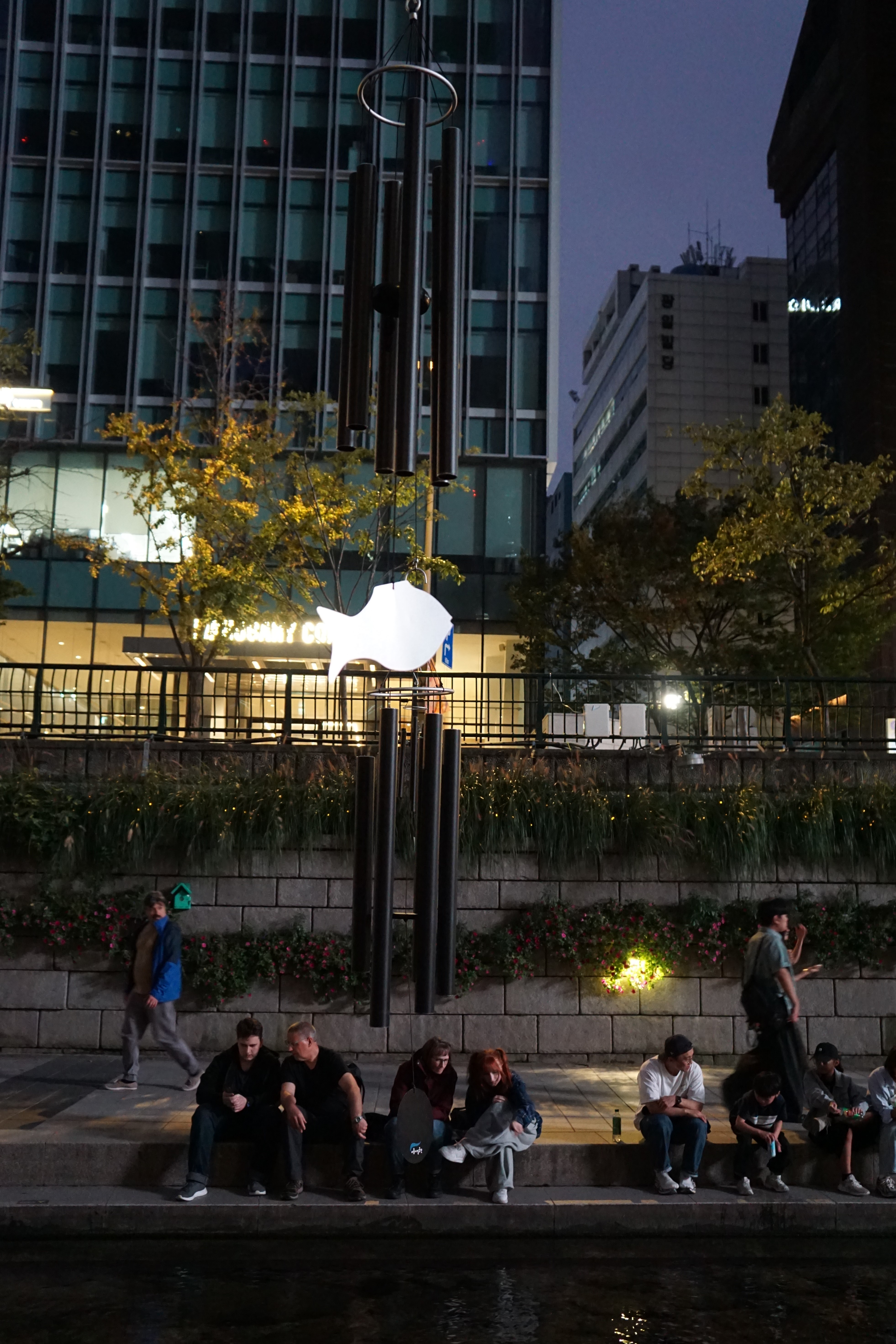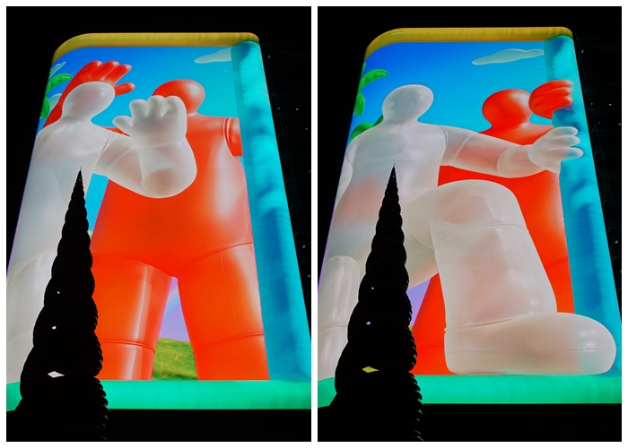 바로 뒤에는 행사 설치물이 풍경을 해치고, 대로 건너 높다란 건물 외벽의 불빛 간판은 더 거슬린다.