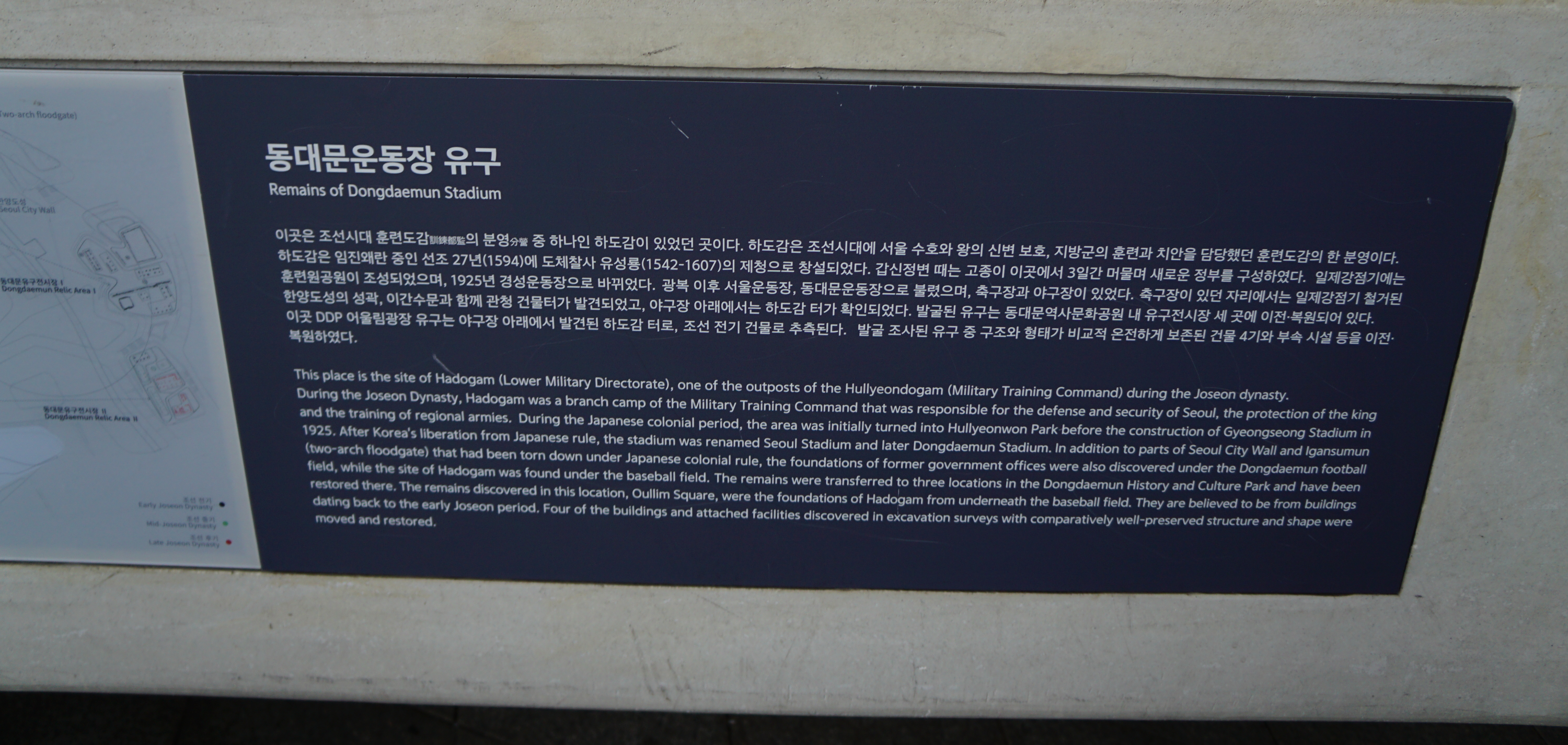 '동대문운동장 유구'인데, 조선시대 서울 수호와 왕의 신변 보호, 지방군의 훈련과 치안을 담당했던 훈련도감의 한 분영인 하도감이 있던 자리인데, 일제 강점기에는 훈련원 공원이 조성되었다가 1925년 경성운동장으로 바뀌었다. 광복 이후 서울운동장,동대문운동장으로 불렸으며, 축구장이 있던 자리에서는 일제 강점기 철거된 한양 도성의 성곽.이간수문과 함께 관청 건물터가 발견되었고, 야구장 아래에서는 하도감터가 확인되었다. 이 곳 DDP 어울림 광장 유구는 야구장 아래에서 발견된 하도감터로, 유구 중 구조와 형태가 비교적 온전하게 보존된 건물 4기와 부속시설 등을 이전.복원하였다.