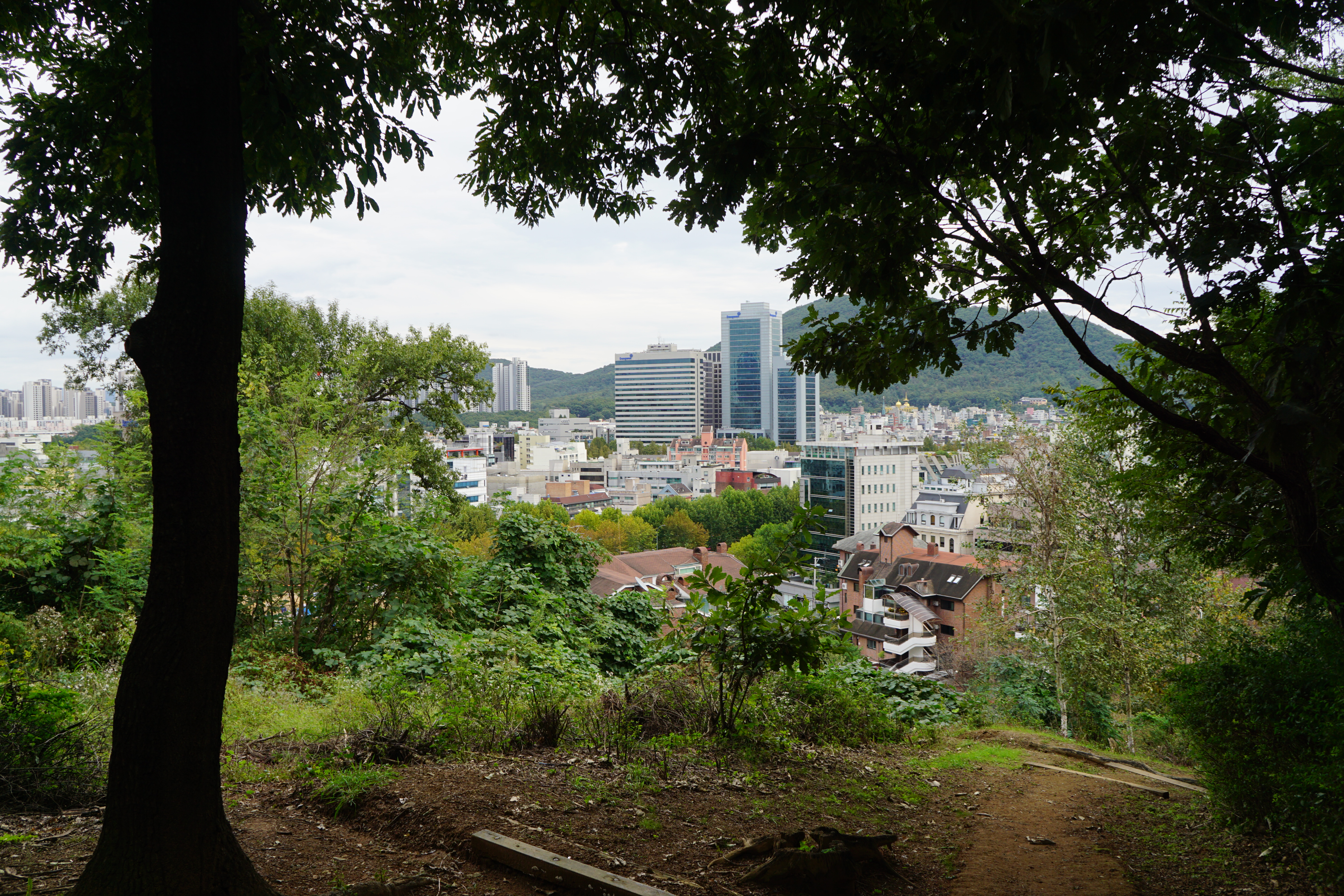 산 아래 마을이 보이는 '말죽거리근린공원'을 내려서는 지점이다.