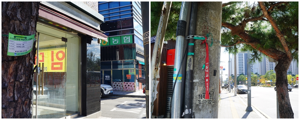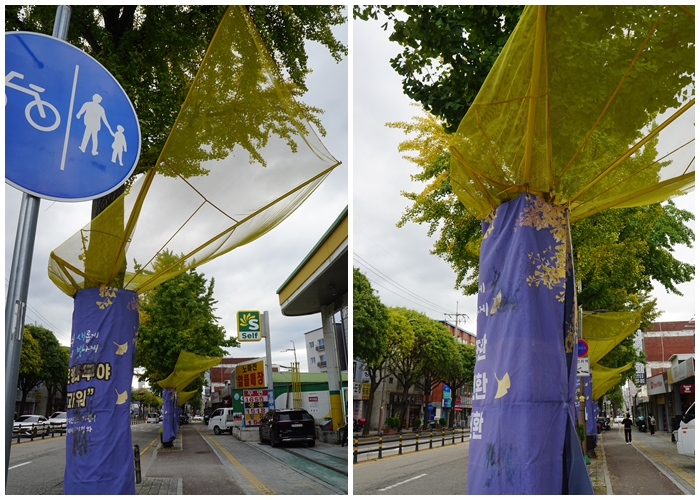 '정조사거리' 횡단보도 앞에서 바라보는 방향 은행나무 가로수 아래 특이한게 매달려있다.