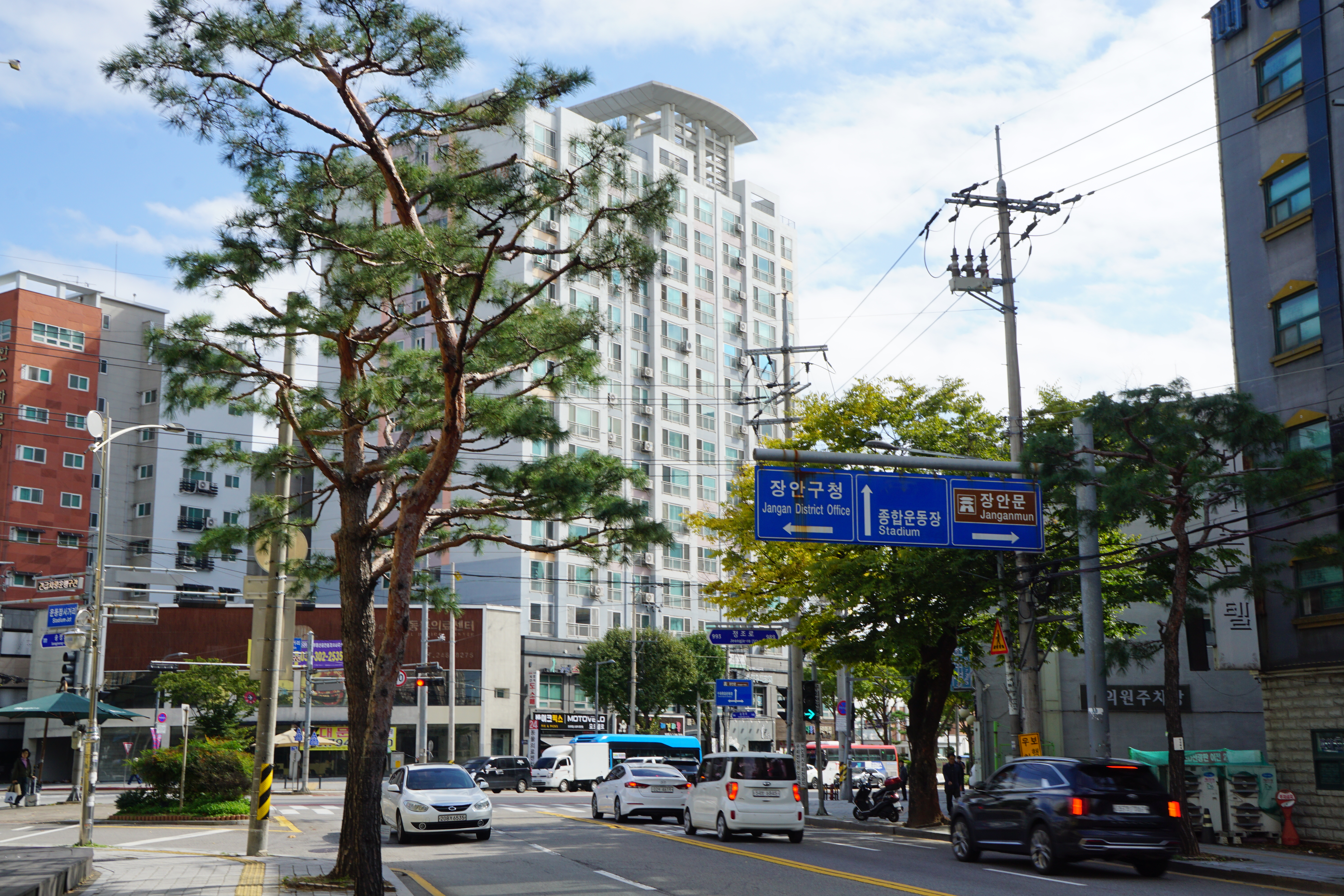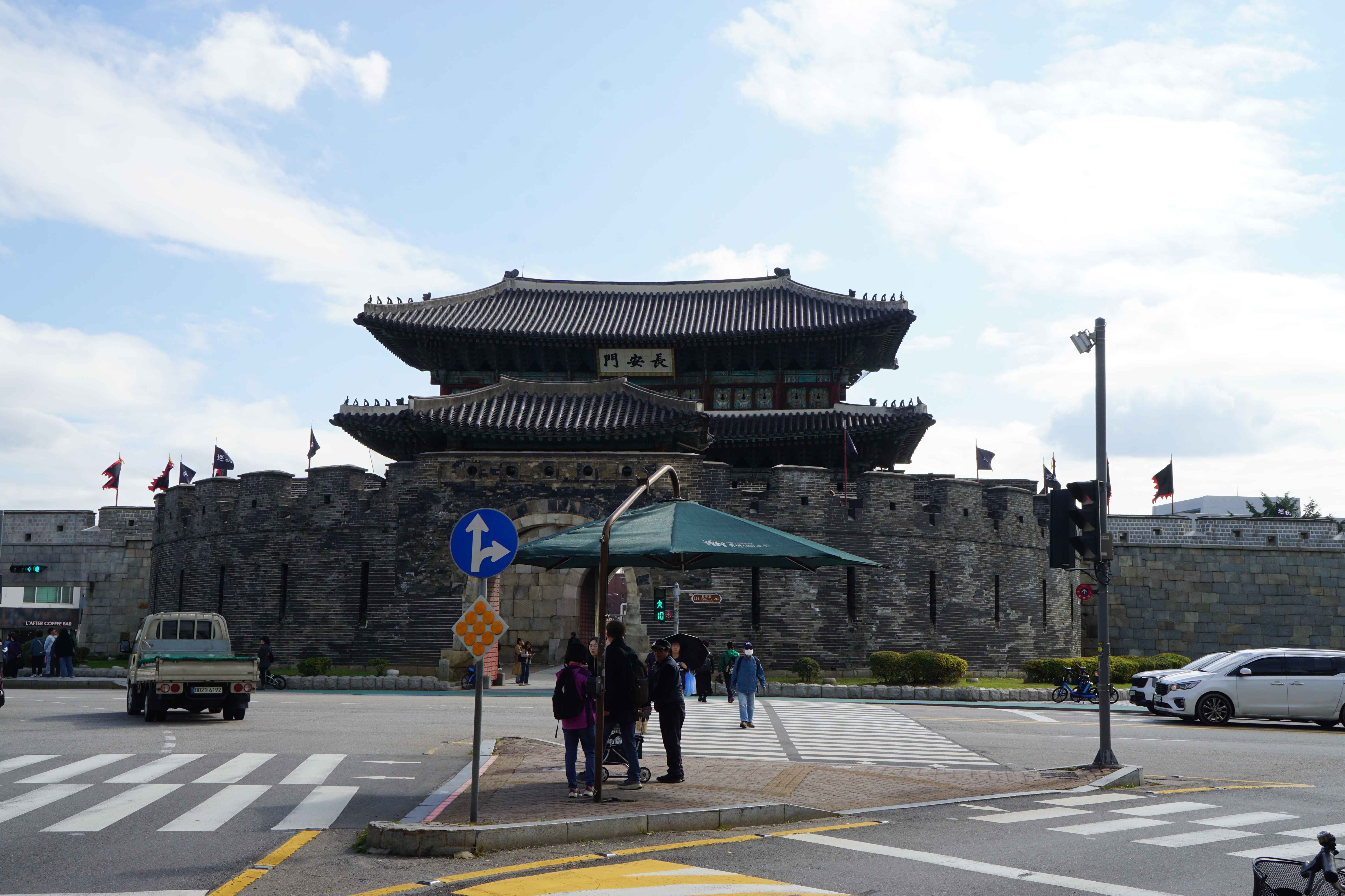 '거북시장사거리' 횡단보도 앞에서 보는 '장안문'
