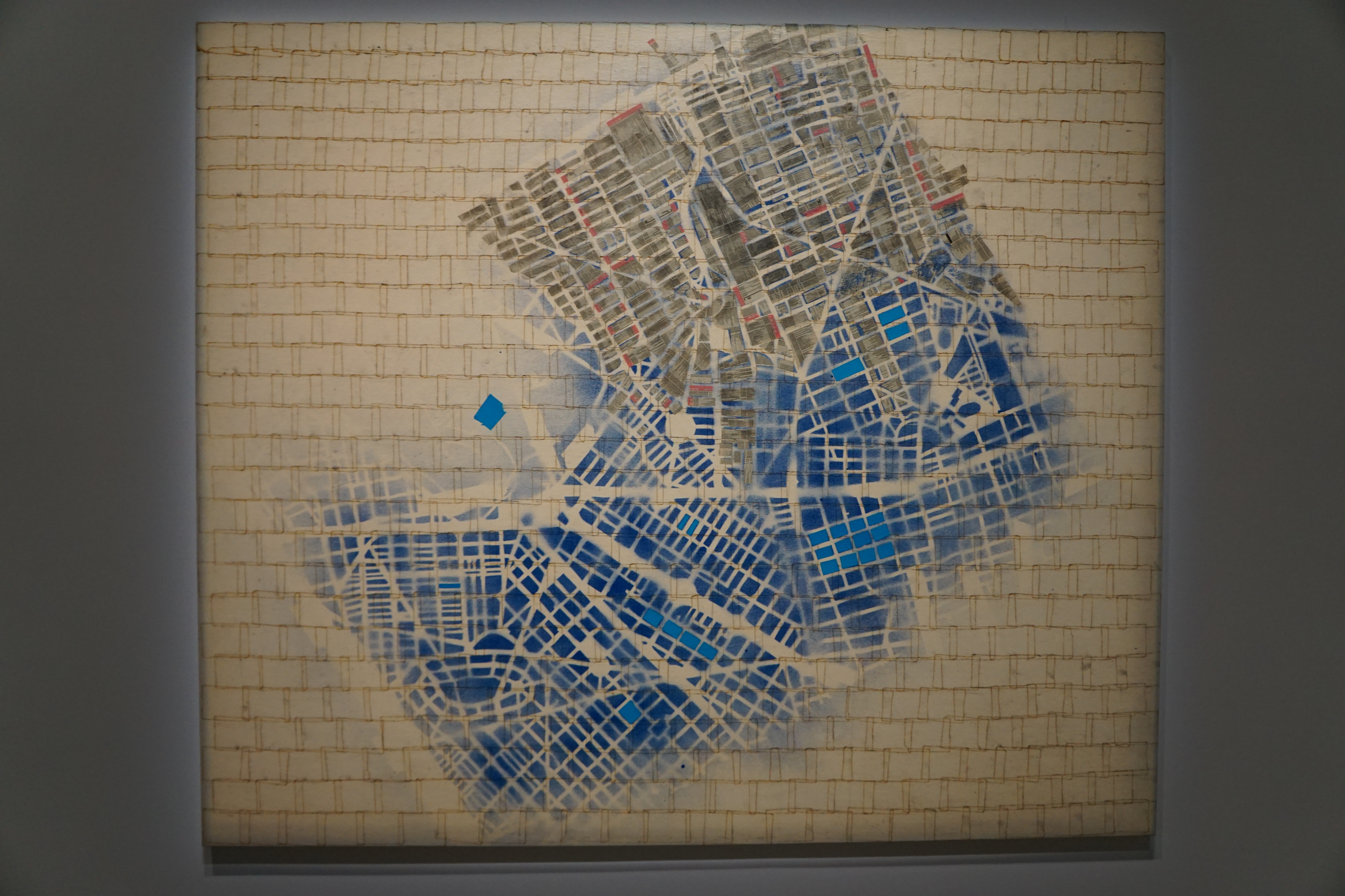 가까이 들여다 보면, 브래드포드는 엔드페이퍼를 겹겹이 덧붙인 표면 위에 파란색 스텐실로 지도 형태를 구현하고,