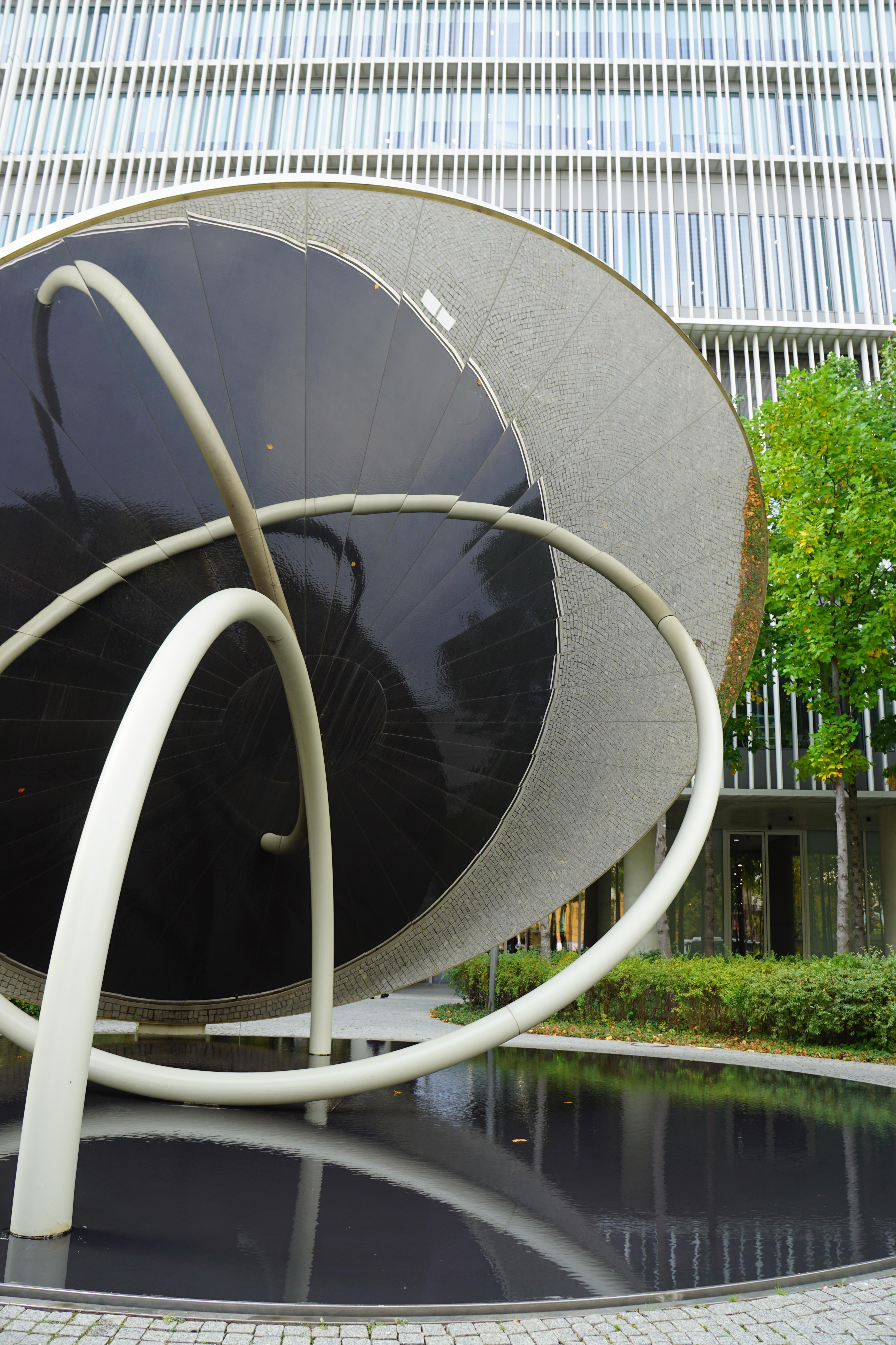 두 개의 반원형 고리는 각각 거울과 검은 수반에 반사되어 서로 얽혀있는 원형으로 완성된다. 상이 무한히 반복되며