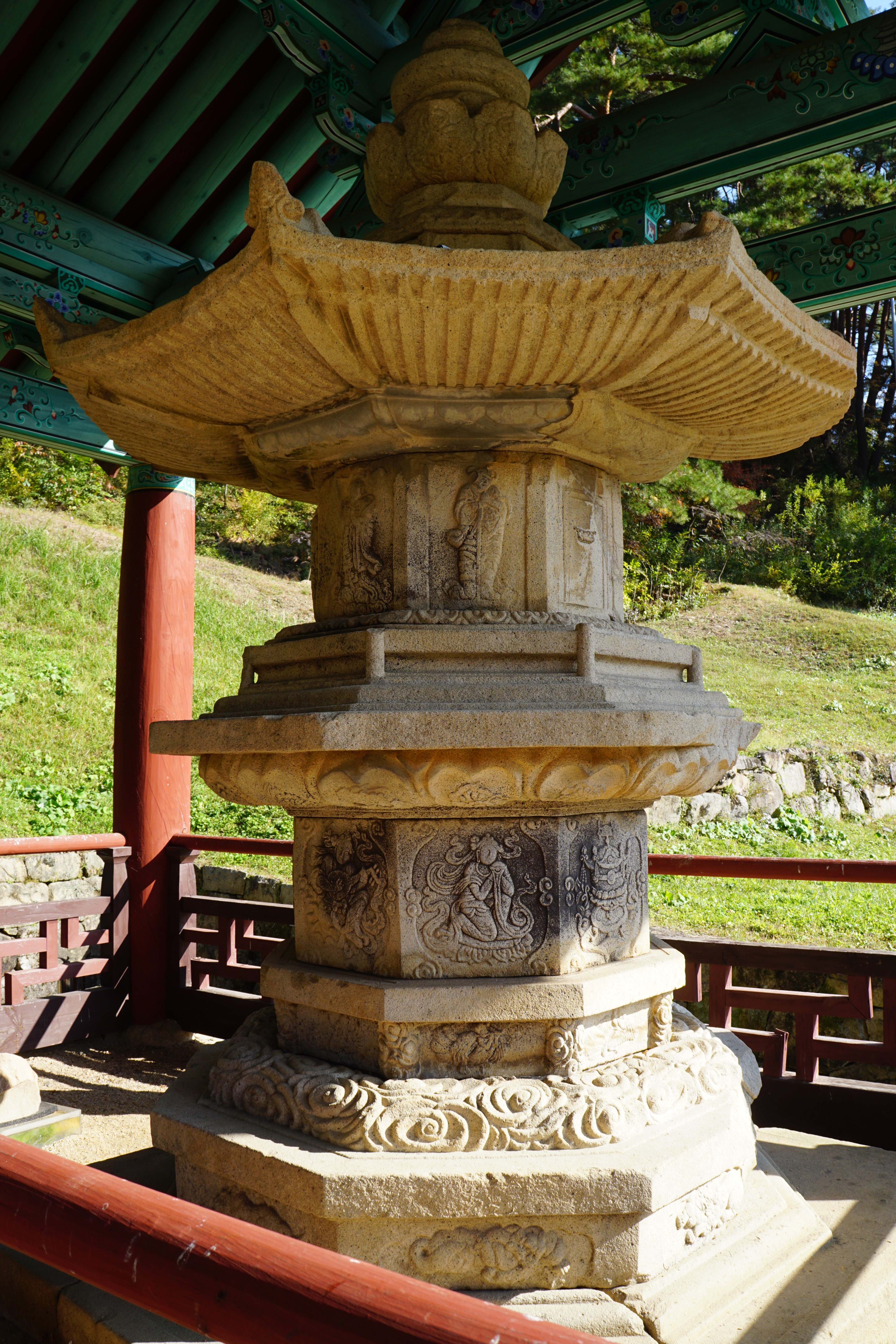 탑신을 돌아가면서 사방으로 악기를 연주하는 악사나 비천이 조각되어 있는 아름다운 사리탑이다.