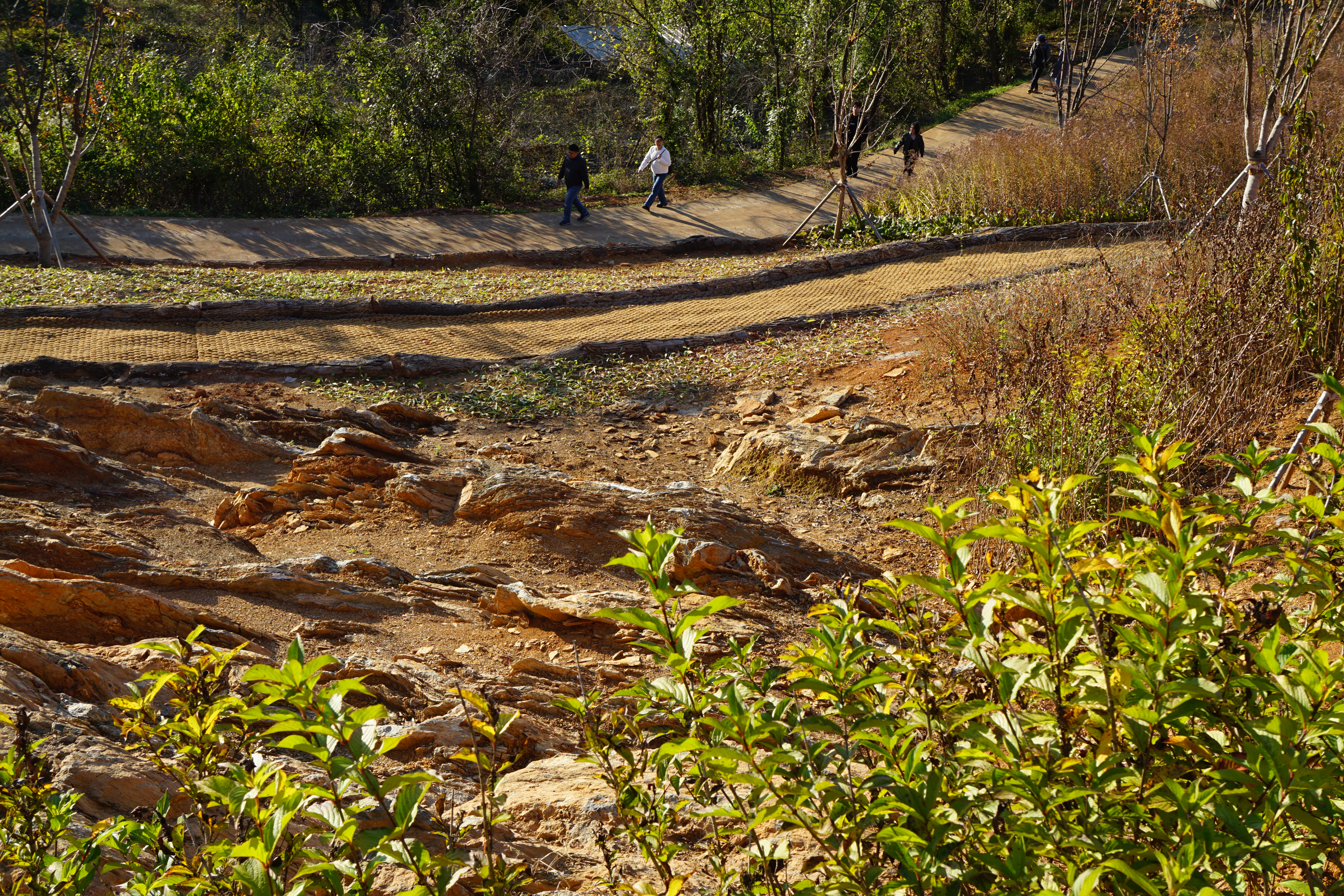 길 아래, 흡수되지 않고 남은 석회암의 모습을 보여주는 '석회암지형'