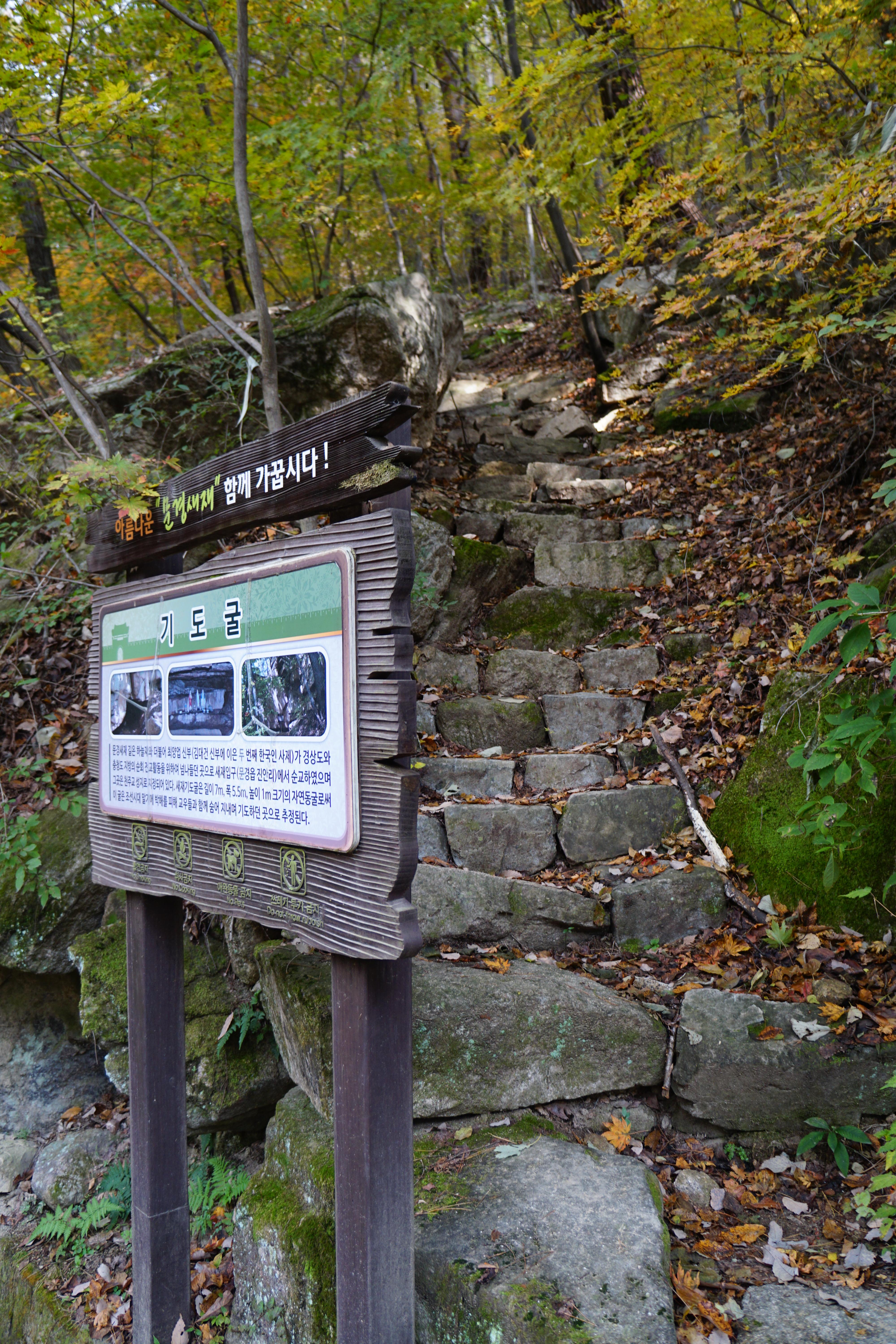 길 옆 좁은 돌계단 아래 '기도굴' 이라는 안내판이 세워져 있다.