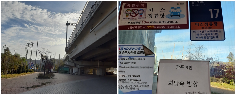 곤지암역 2번 출구로 나와서 오른쪽 고가 아래 '화담숲'으로 가는 광주 9번 버스 정류장이 있다.(09시50분)
