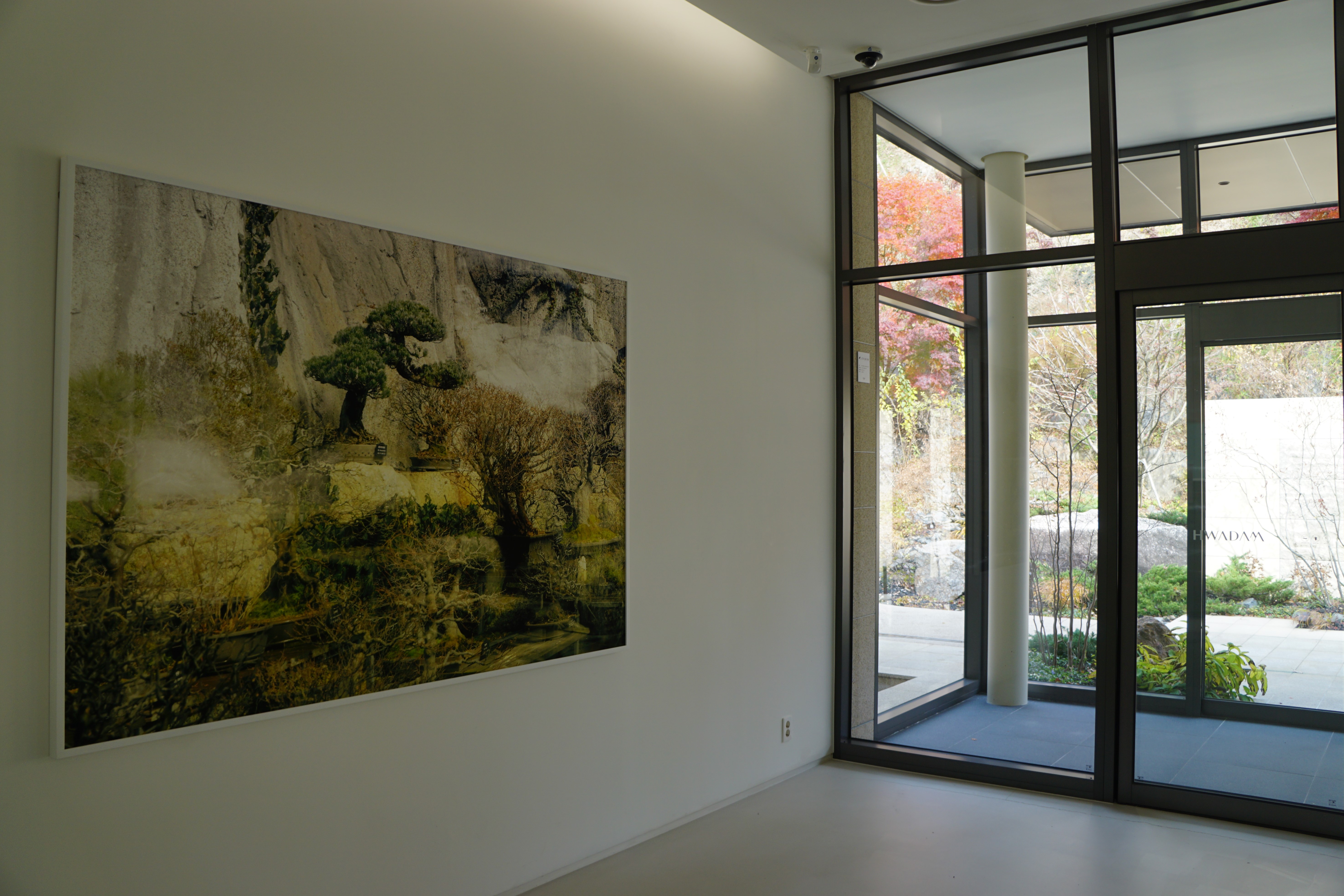 '별채'로 들어서는 암막 커튼을 들추고 입장하면 방 안 가득 '화담숲'의 사계와 꽃의 일생, 소나무 정원을 담은