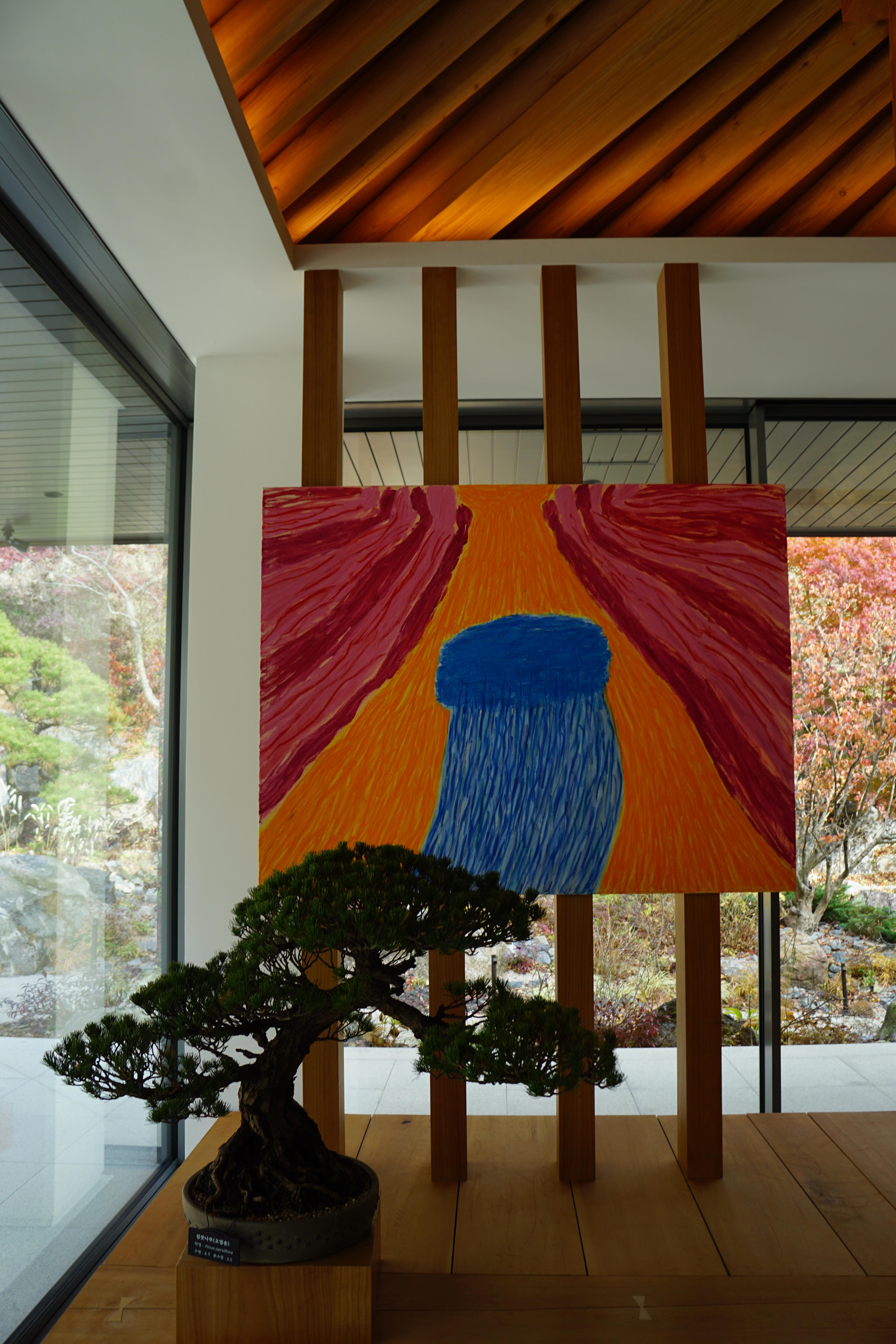 분재를 위한 빛과 물을 재해석한 문규화 작가의 회화작품과 분재.