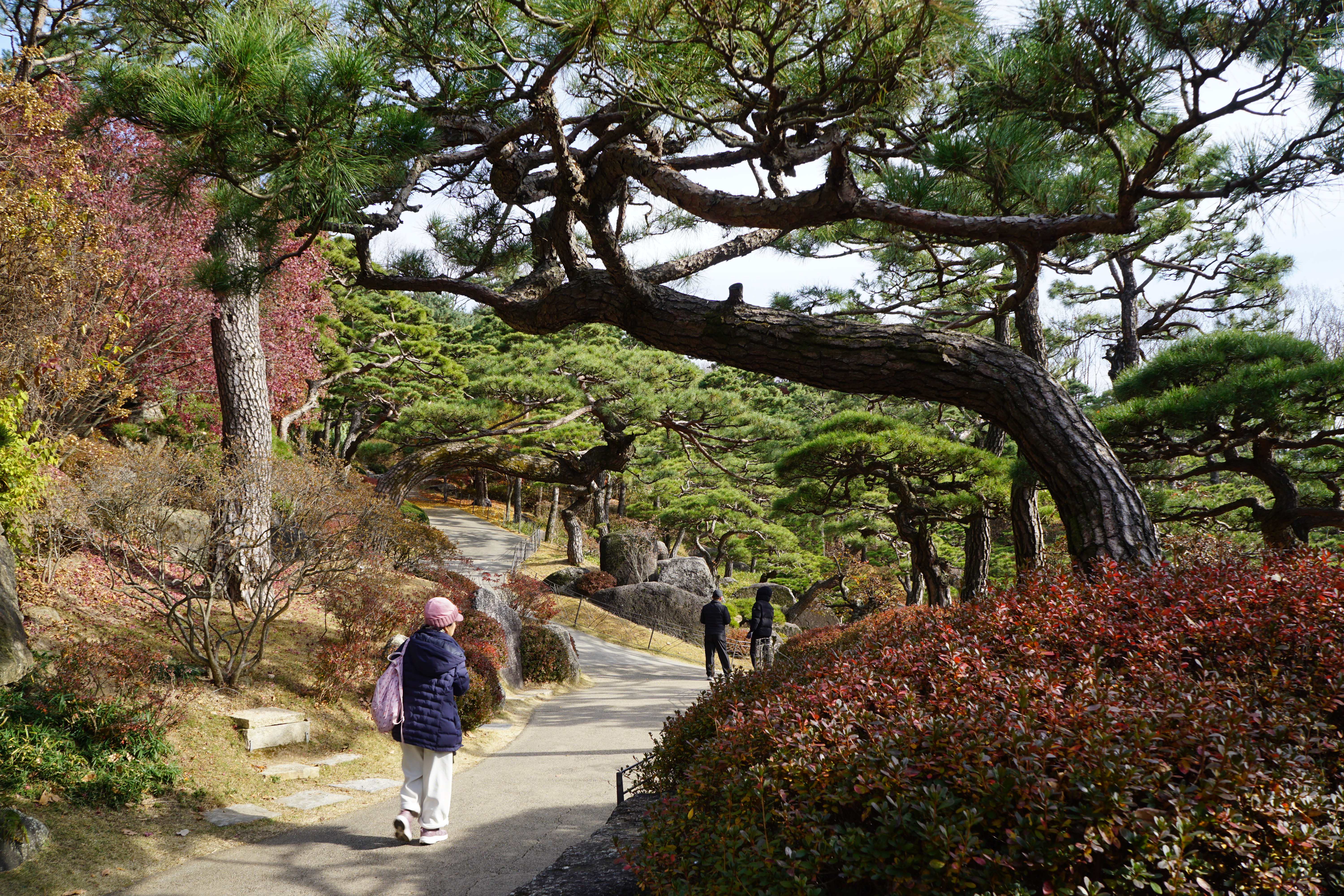 몇 그루의 단풍과 소나무가 조화를 이루고 있는 '소나무 정원'에서 혼자 고군분투한 흔적이 역력한 공작단풍나무 한 그루.