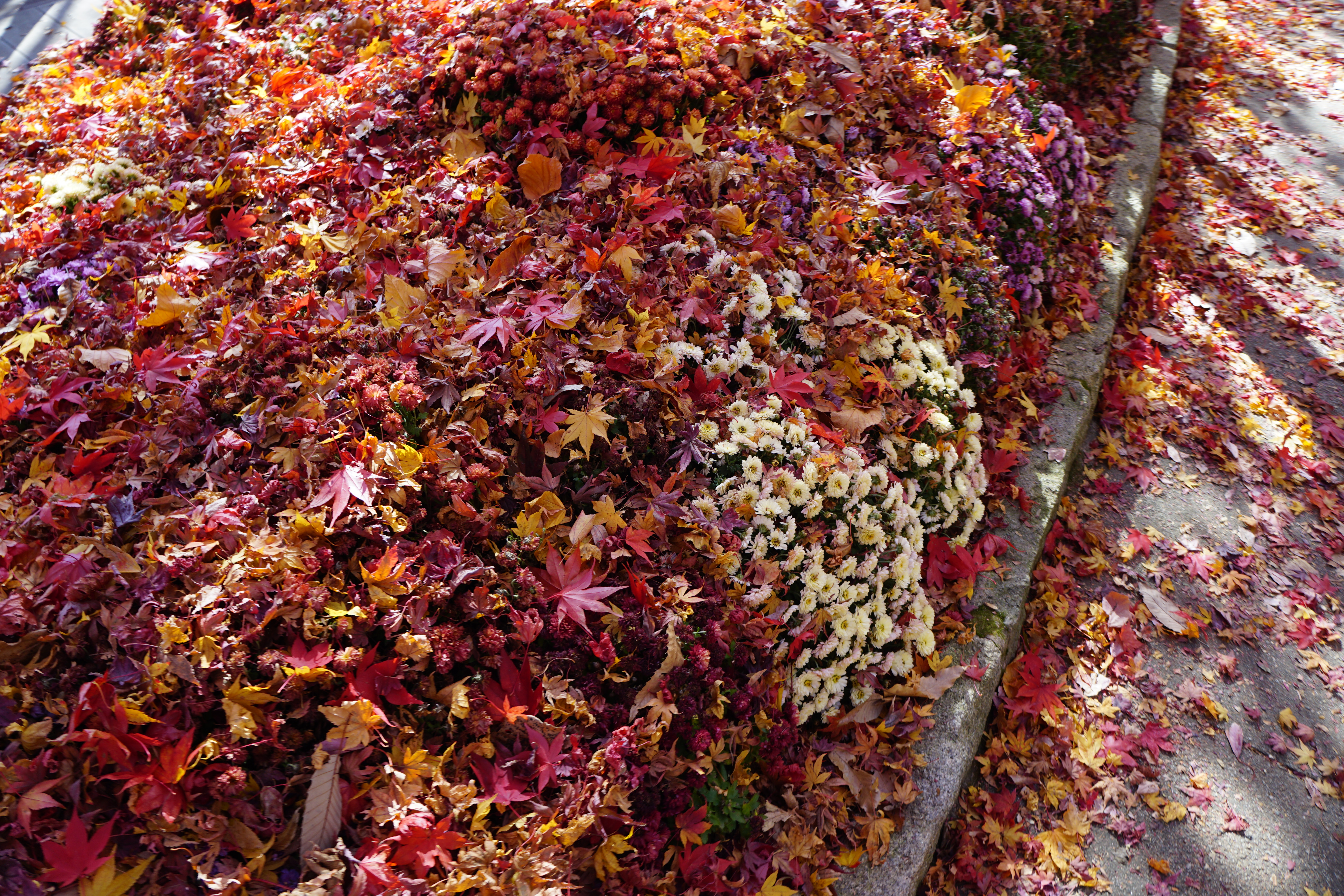 단풍나무 아래 심어놓은 가을 꽃의 여왕, 국화는 자기 보다 더 색 고운 단풍나무 낙엽에 깔려 영 맥을 못춘다.
