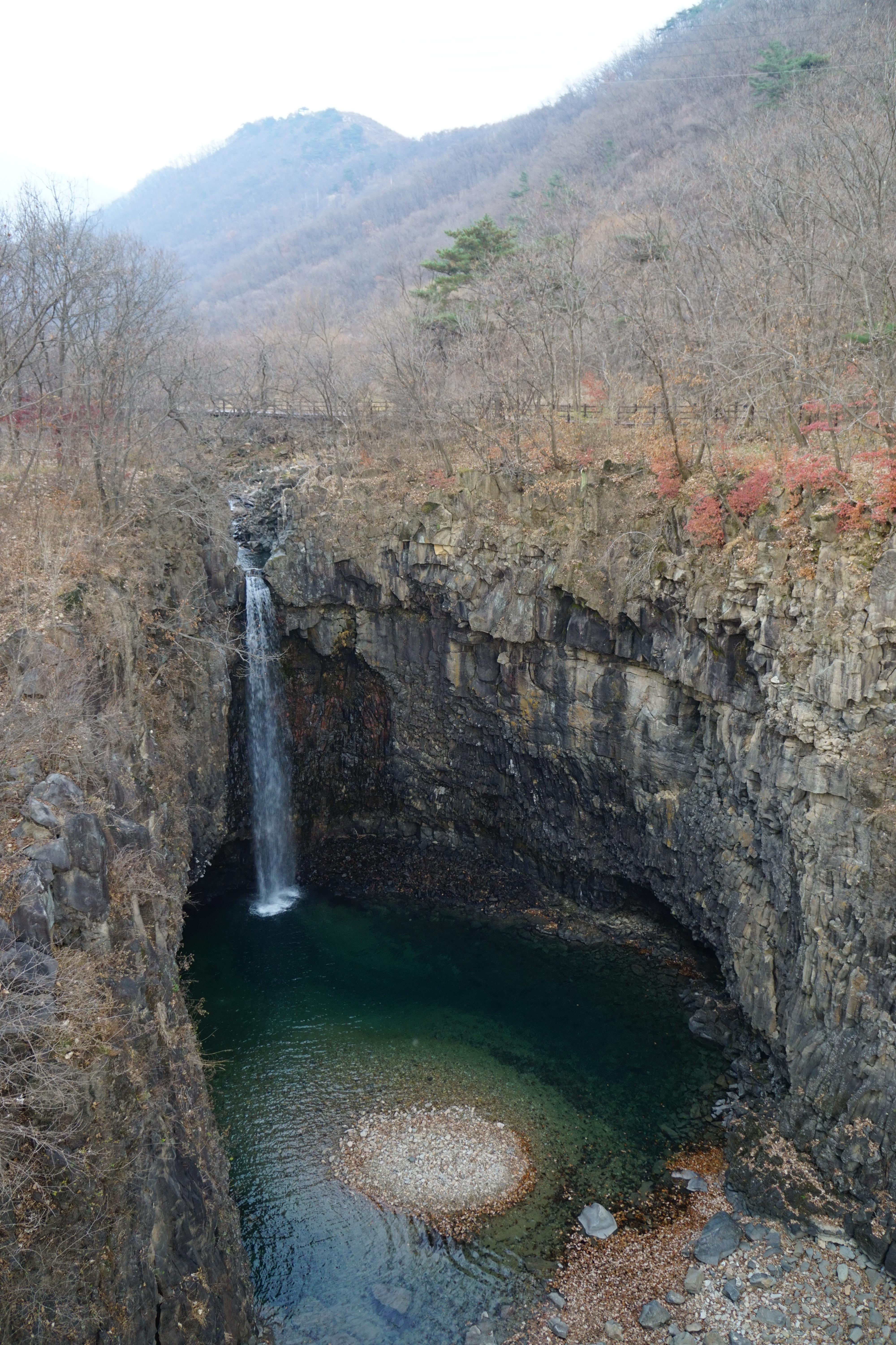 폭포 위 지장봉에서 흘러내려 온 계곡물이 현무암을 점점 깎아내려서 주상절리와 현재의 아름다운 폭포를 만들었다.