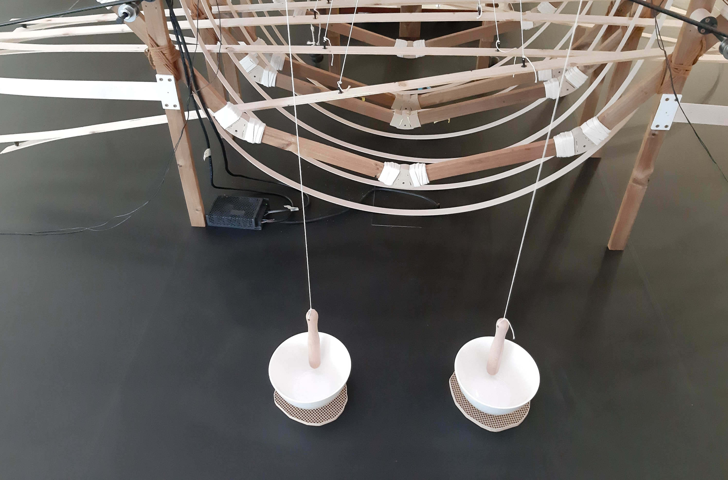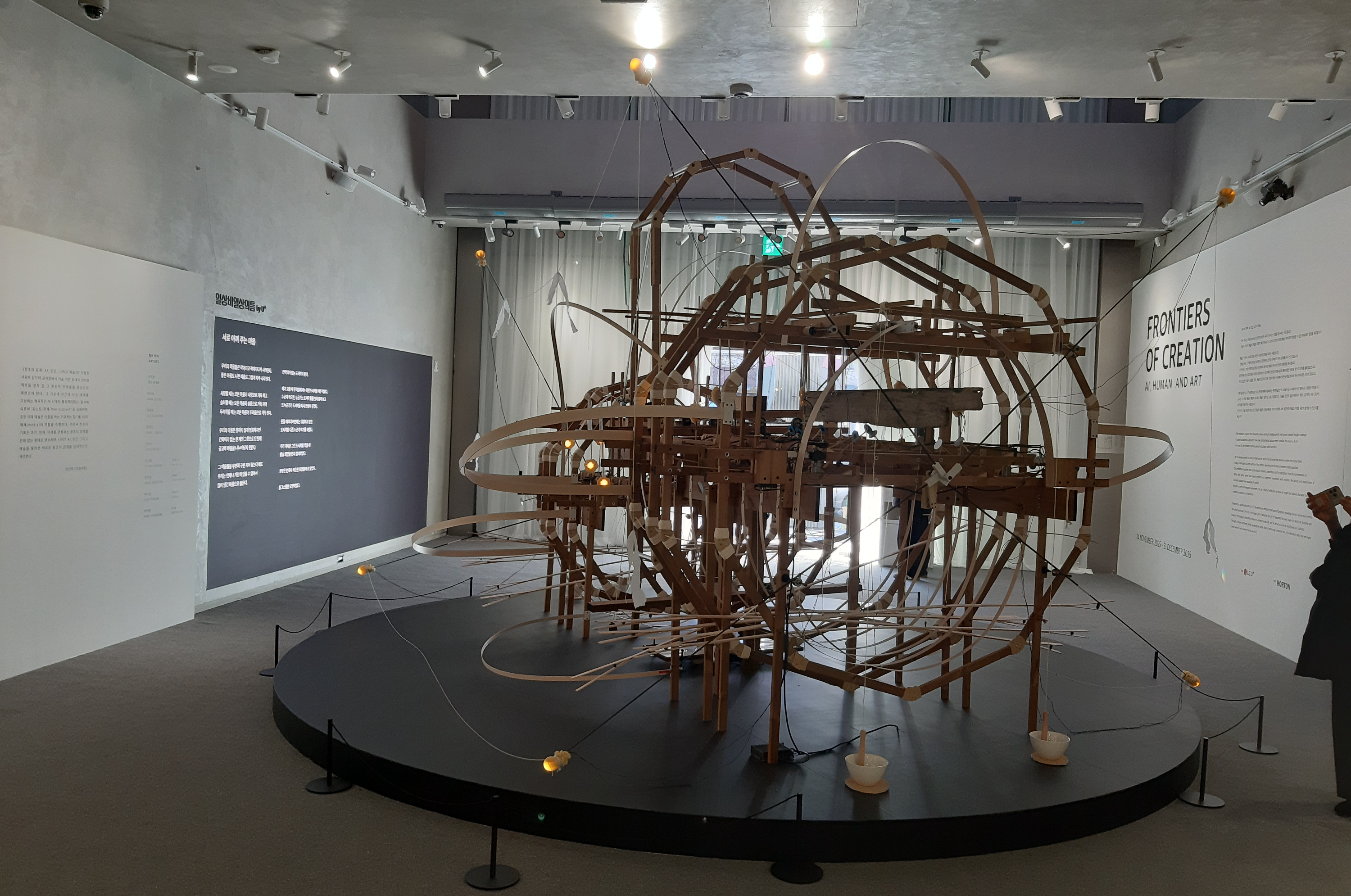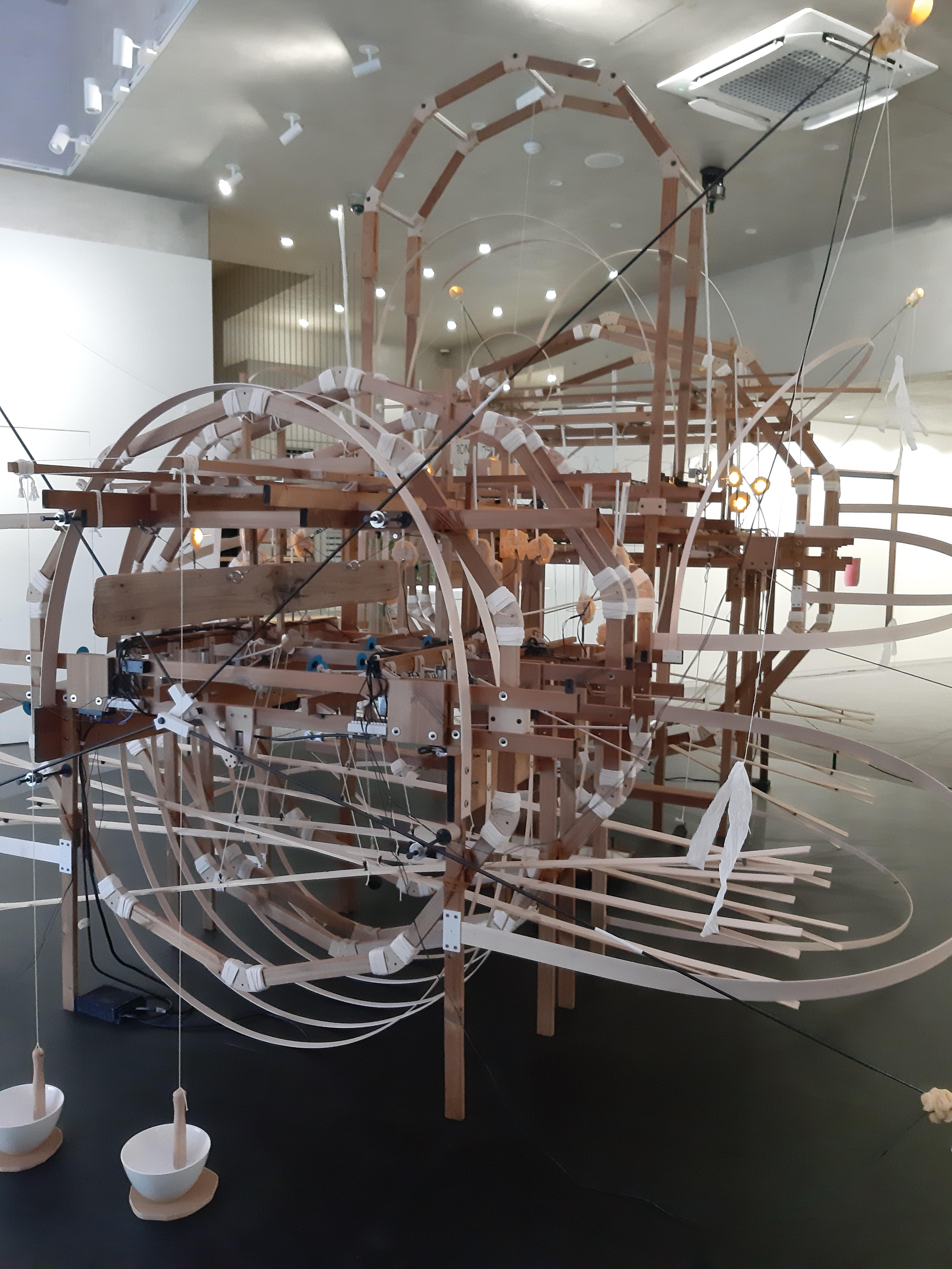 전시장 입구 전시실 가장 가운데 있는 작품은 모터로 계속 움직이면서 모빌로 연결된 나무 막대기가