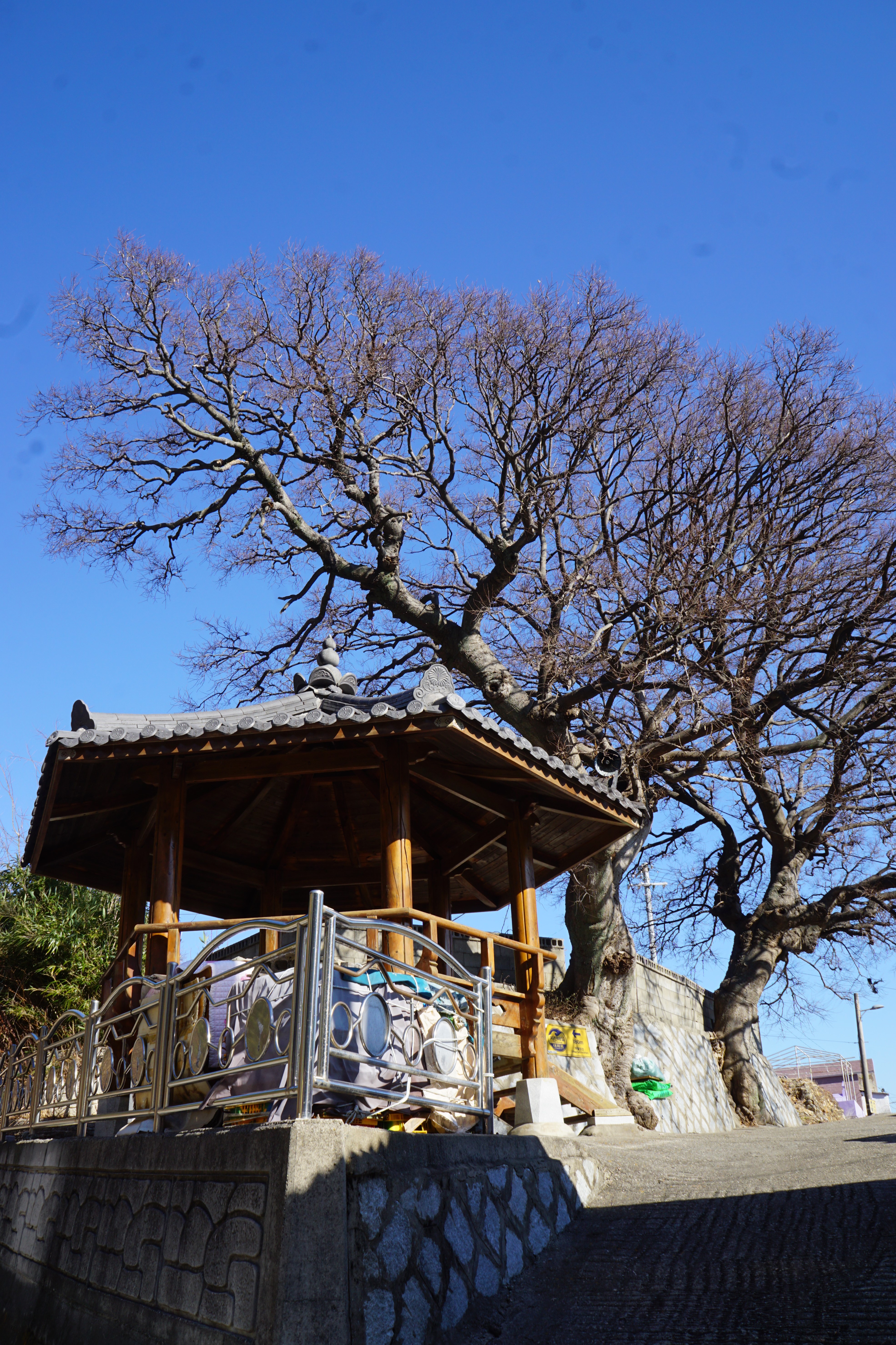마을 길의 버스정류장에 앉아서 커피와 구운 반건조 오징어를 먹었다.