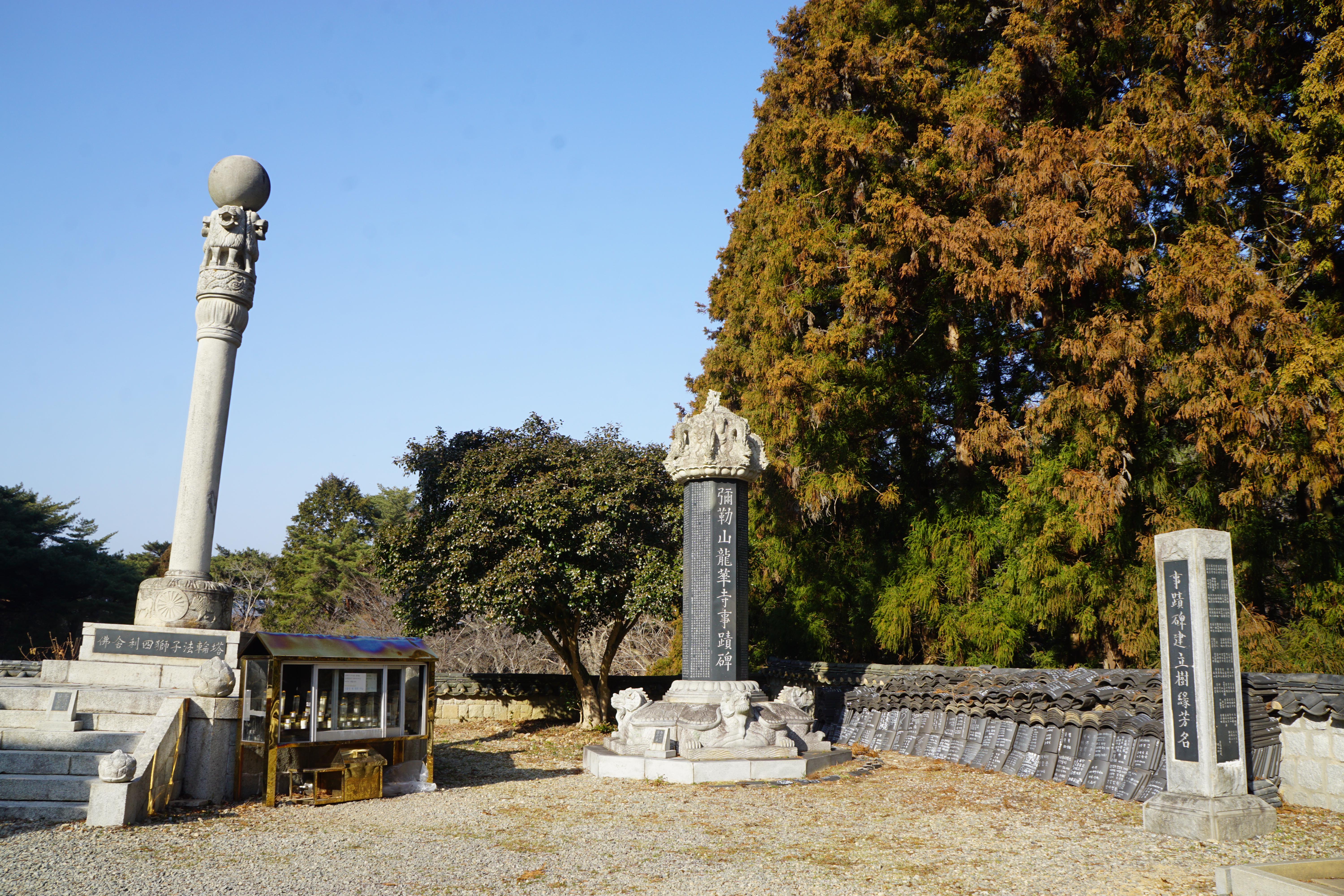 가장 왼편의 '불사리 4사자 법륜탑'은 우리나라에서 보기 드문 고대 아쇼카 양식의 원주 석탑으로, 진신사리 7 과가 봉안되어 있다.