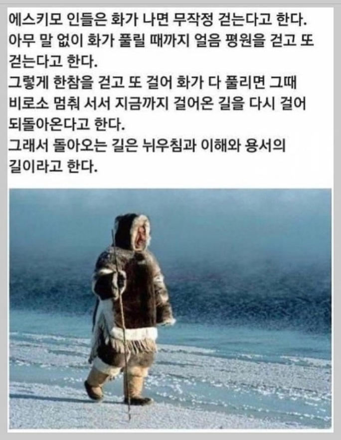 에스키모인들 이야기이다. 읽는 순간, 가슴이 쿵 울리는 감동에 공감이 가는 이야기였다.