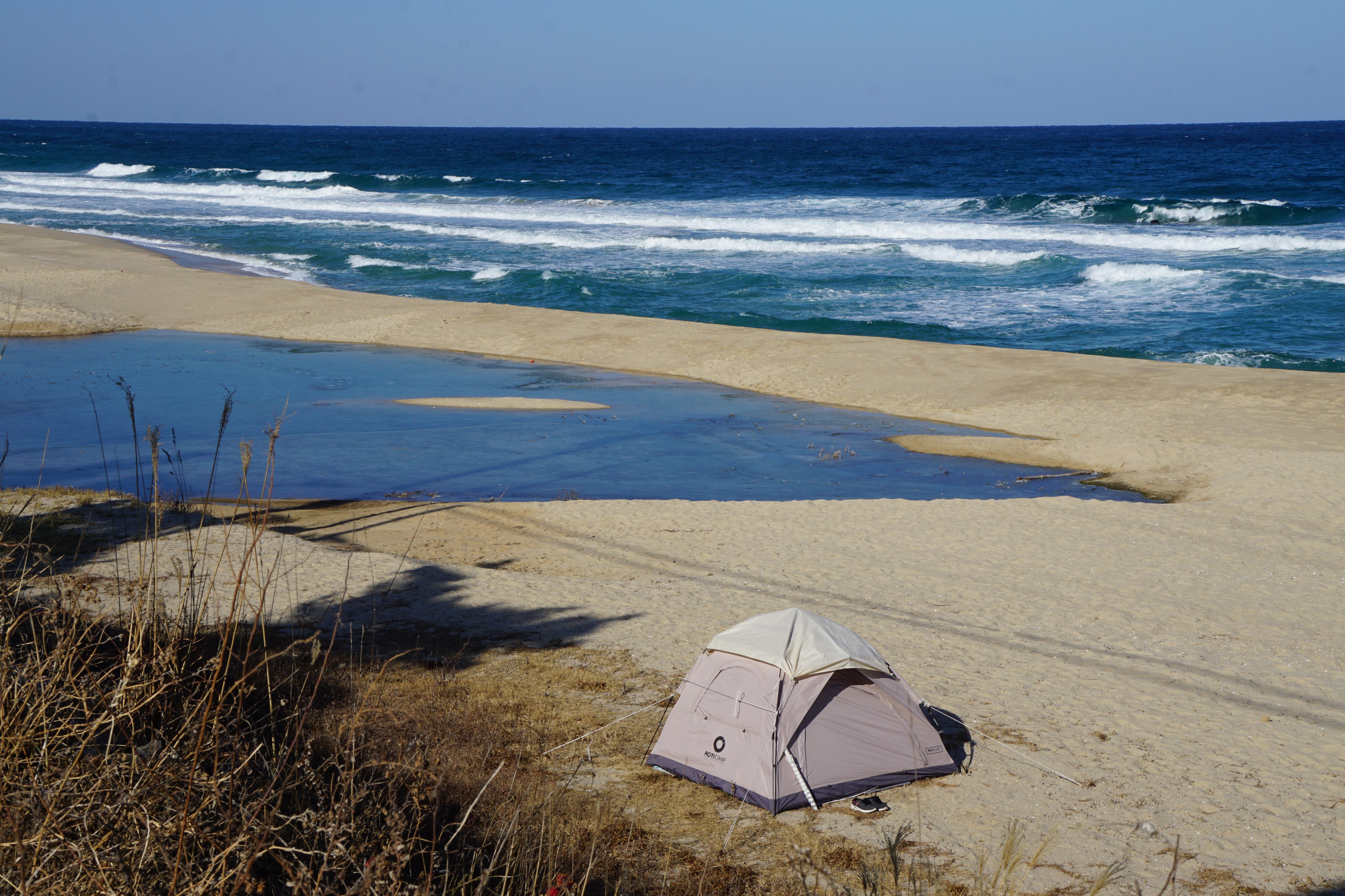 하이고~ 이렇게 바람이 사납게 달겨드는 해변에 텐트가... 옆에는 동그마니 벗은 신발도 보인다.