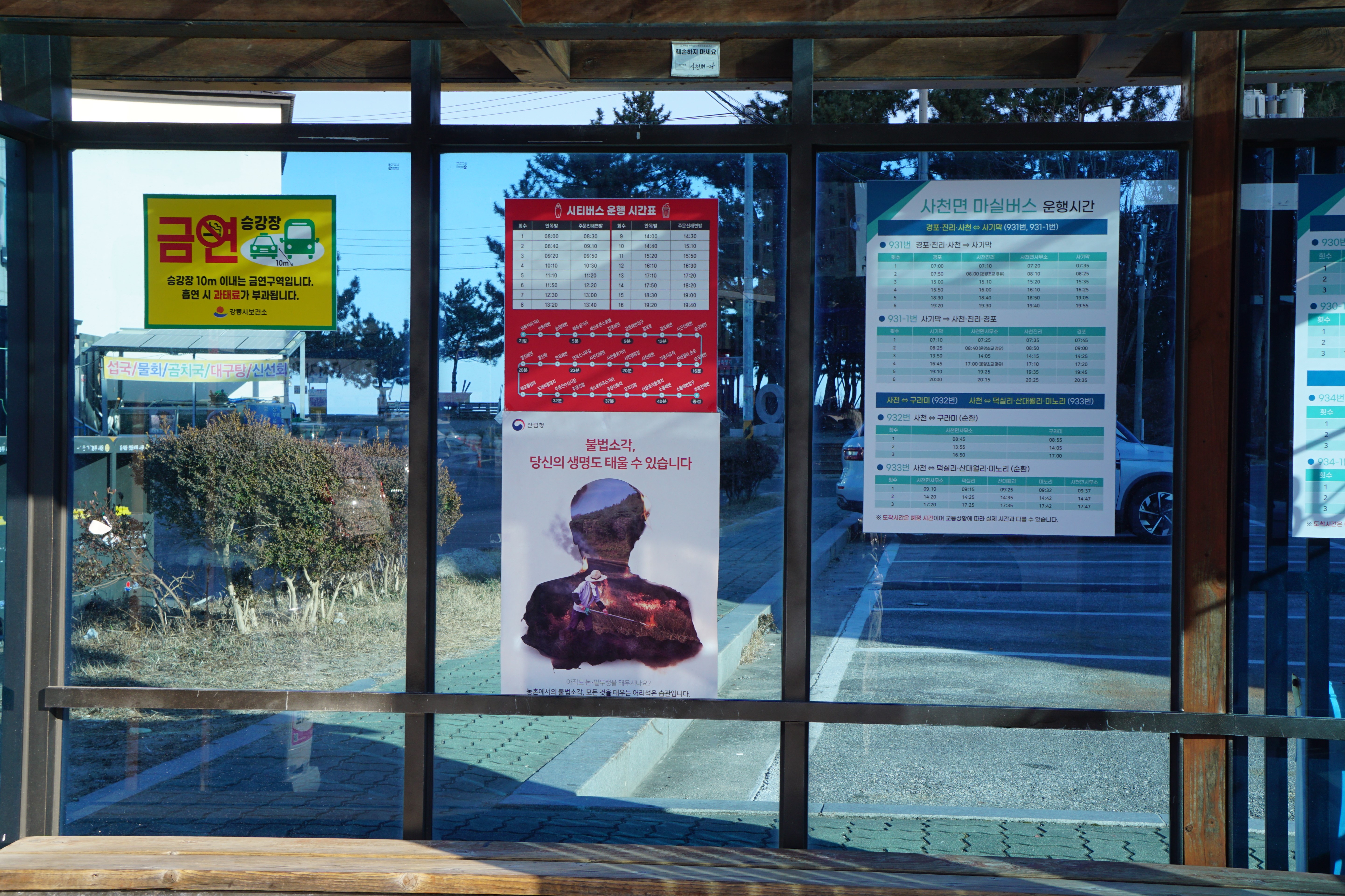 사천진해변 입구의 버스정류장 앞에서 오늘 일정을 마치고 숙소를 찾아 간다.(15시 50분/ 약 15km)