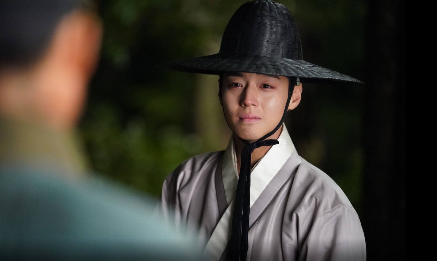 왕이 쓰는 챙이 넓은 갓이 아닌 평민들이나 씀직한 검은 죽립(흑립) 위로부터 흘러내리는 물줄기를 고스란히 받으며