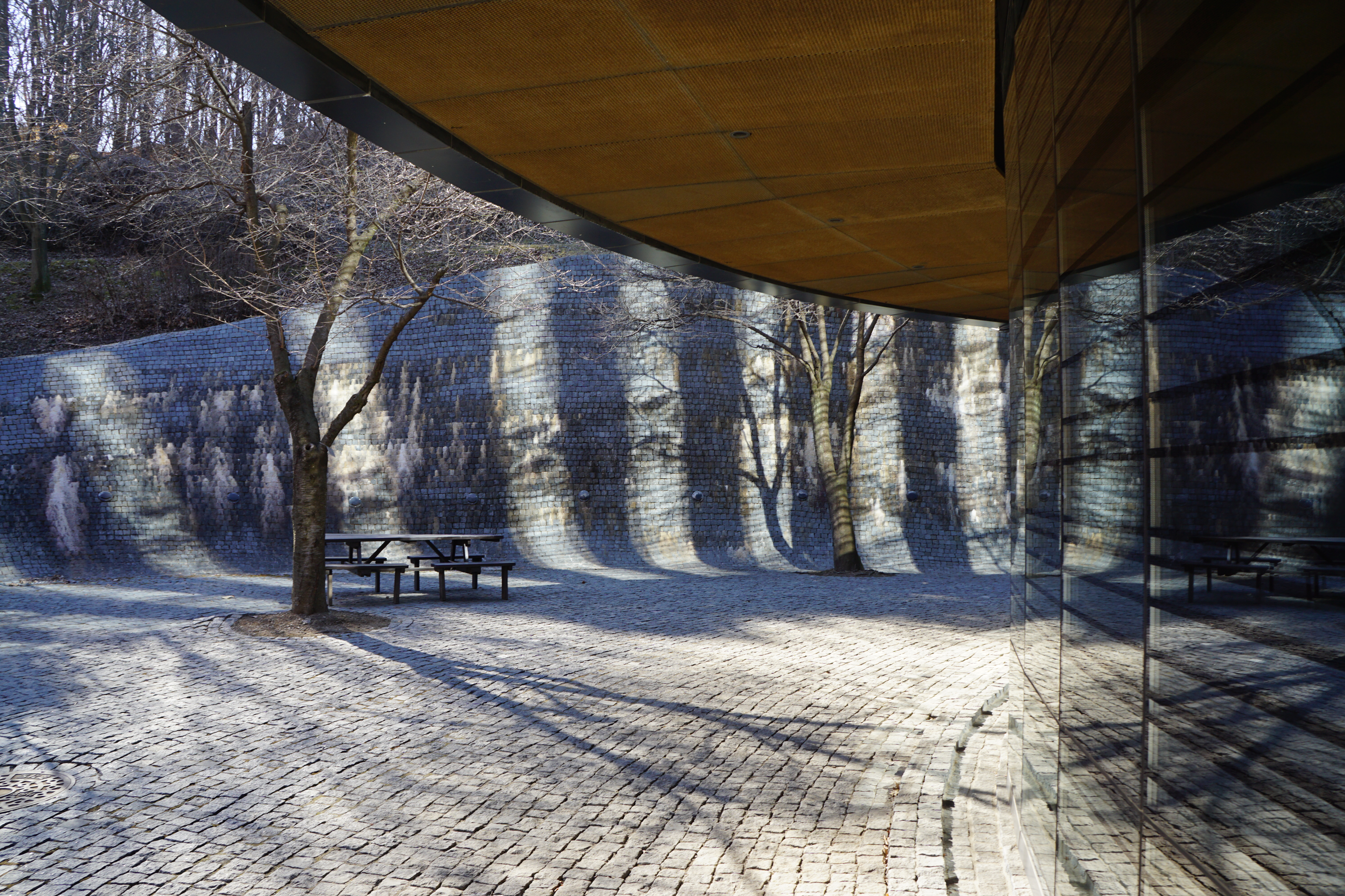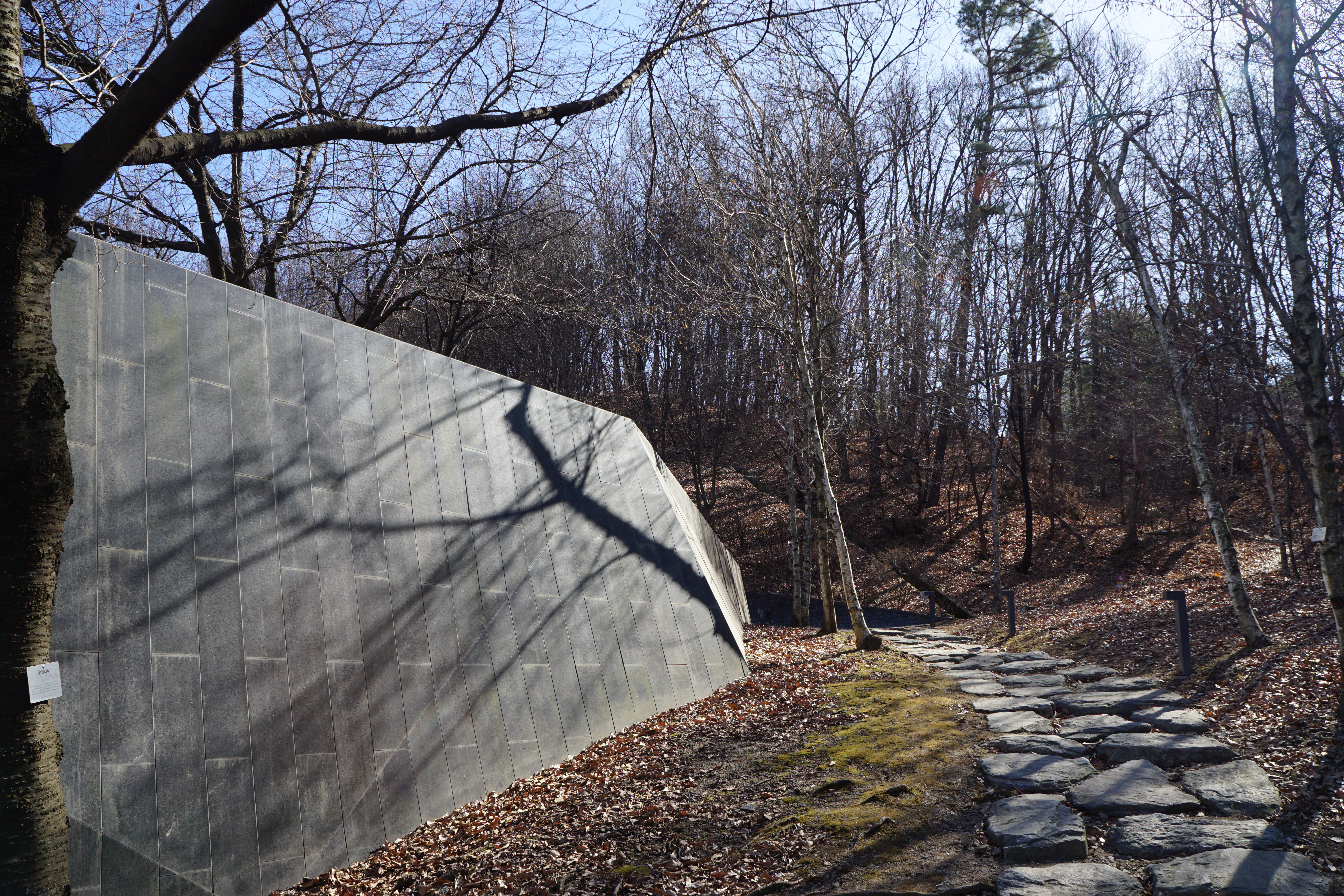 의도한 것인지, 옹벽의 독특한 얼룩과 함께 설치 건축물이라고 해도 믿을 것 같다.