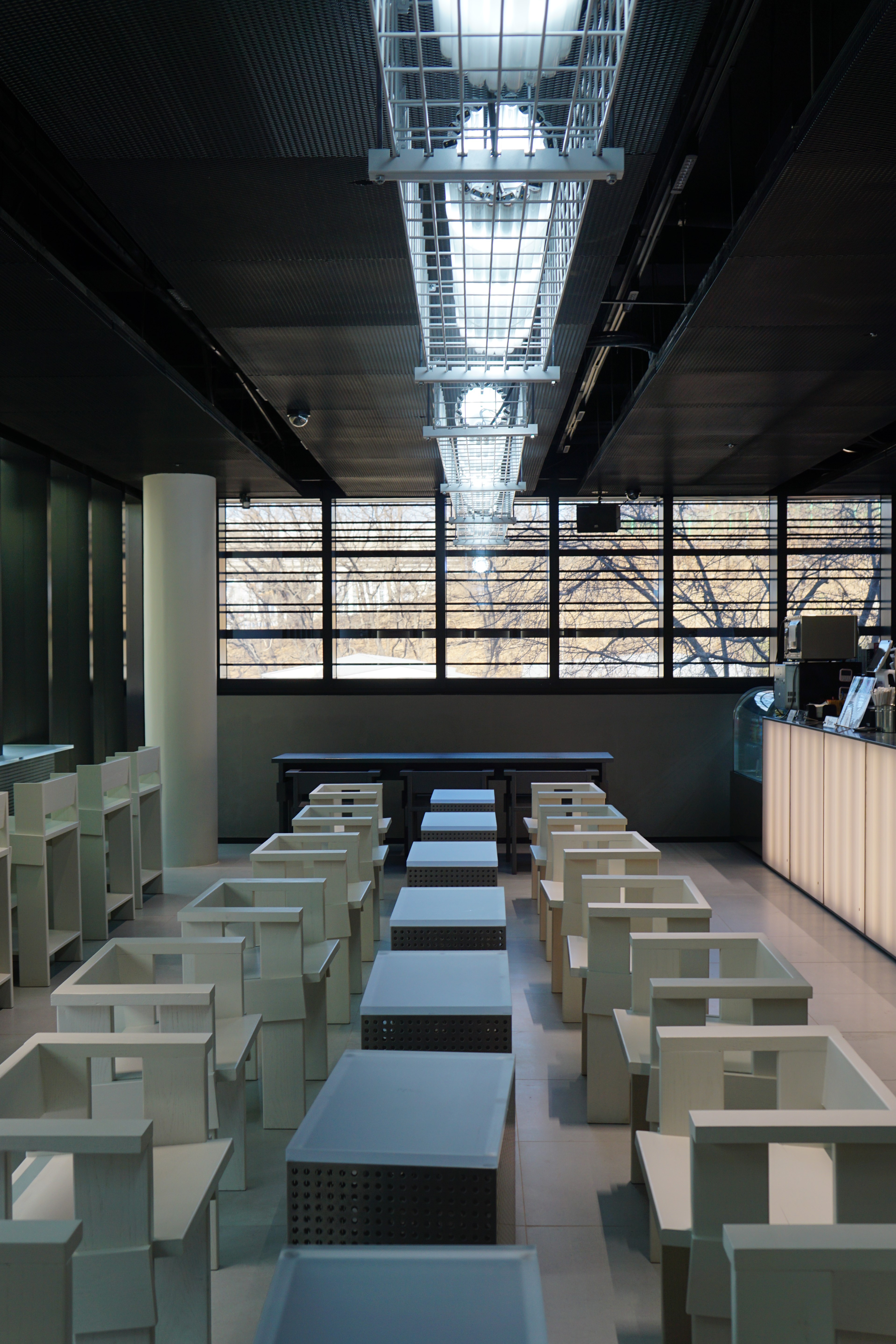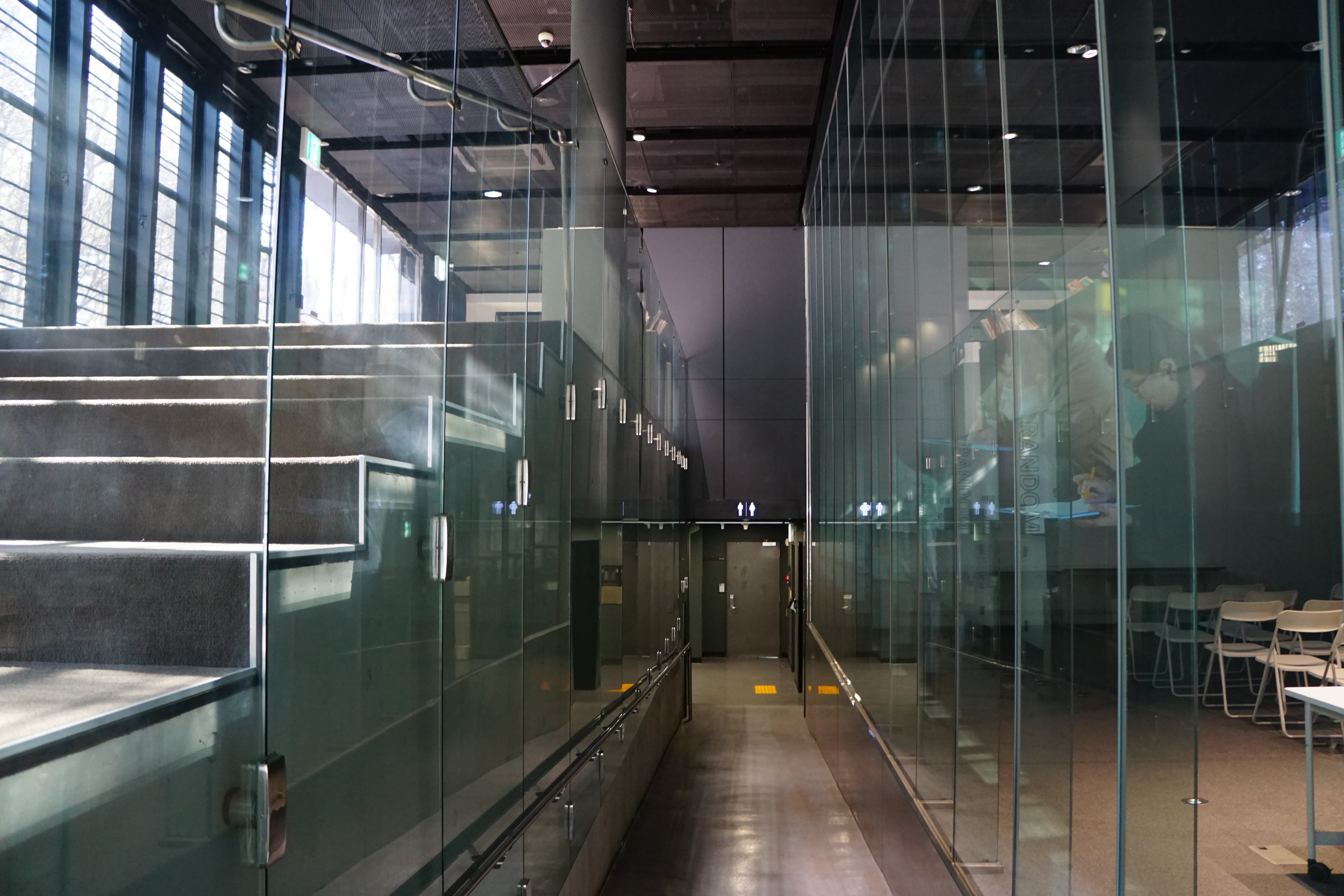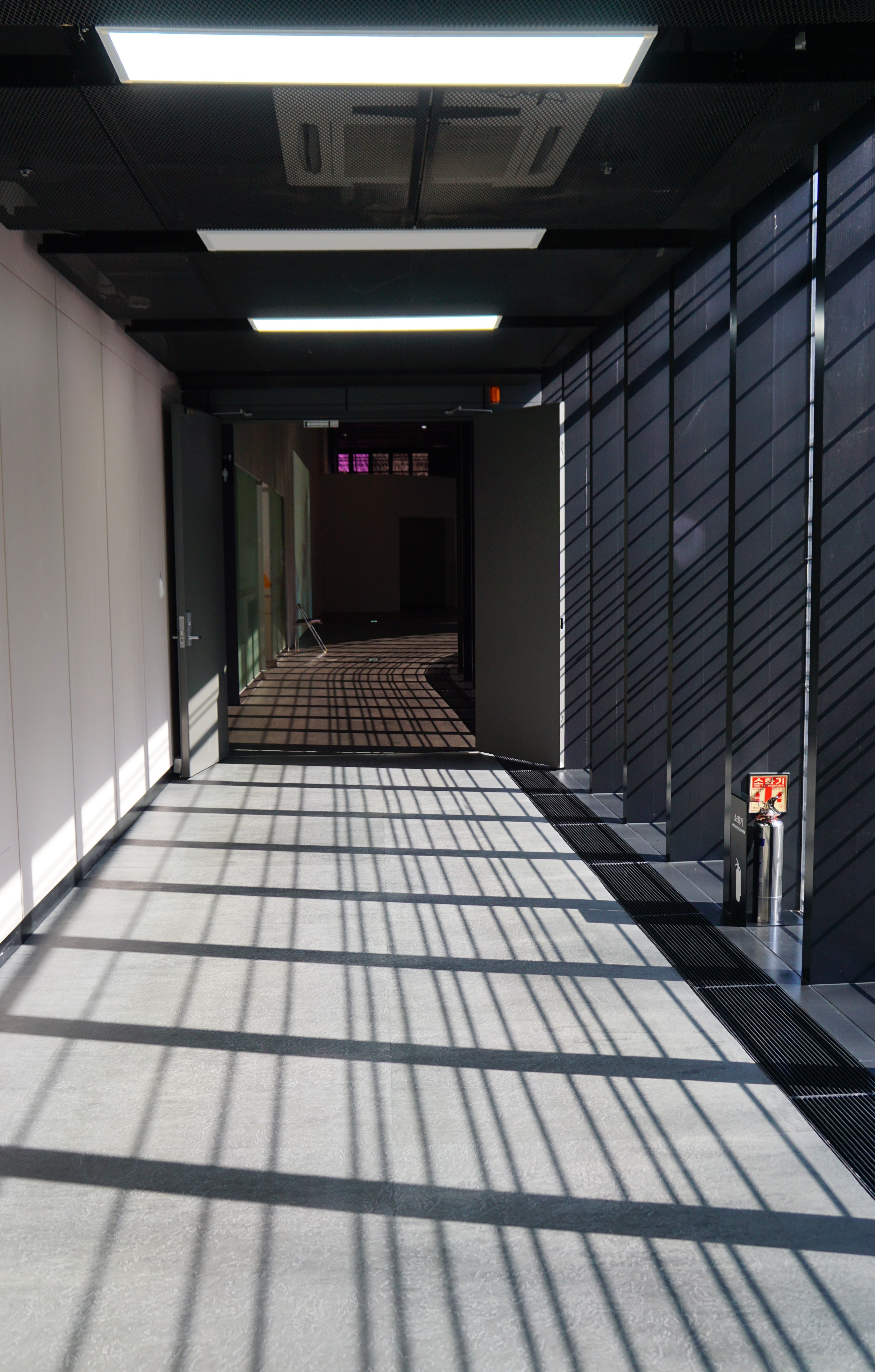 복도에 줄 무늬를 만들어내는 건물의 외관을 보고 싶어서 건물 밖으로 나왔다.